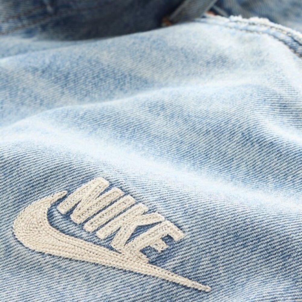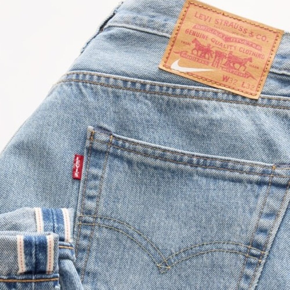 Levi's® x Nike 聯名膠囊系列中的丹寧夾克外套,及 Baggy 寬管繭型丹寧褲,結合現代版型,重新演繹經典丹寧輪廓,採用正宗赤耳布邊布丹寧布料與中淺水洗色澤,搭配極具代表性的米白色鍊式縫線細節,並以 Nike swoosh 標誌性符號點綴於 Levi's® 經典雙馬皮牌上,打造聯名系列的限定細節。