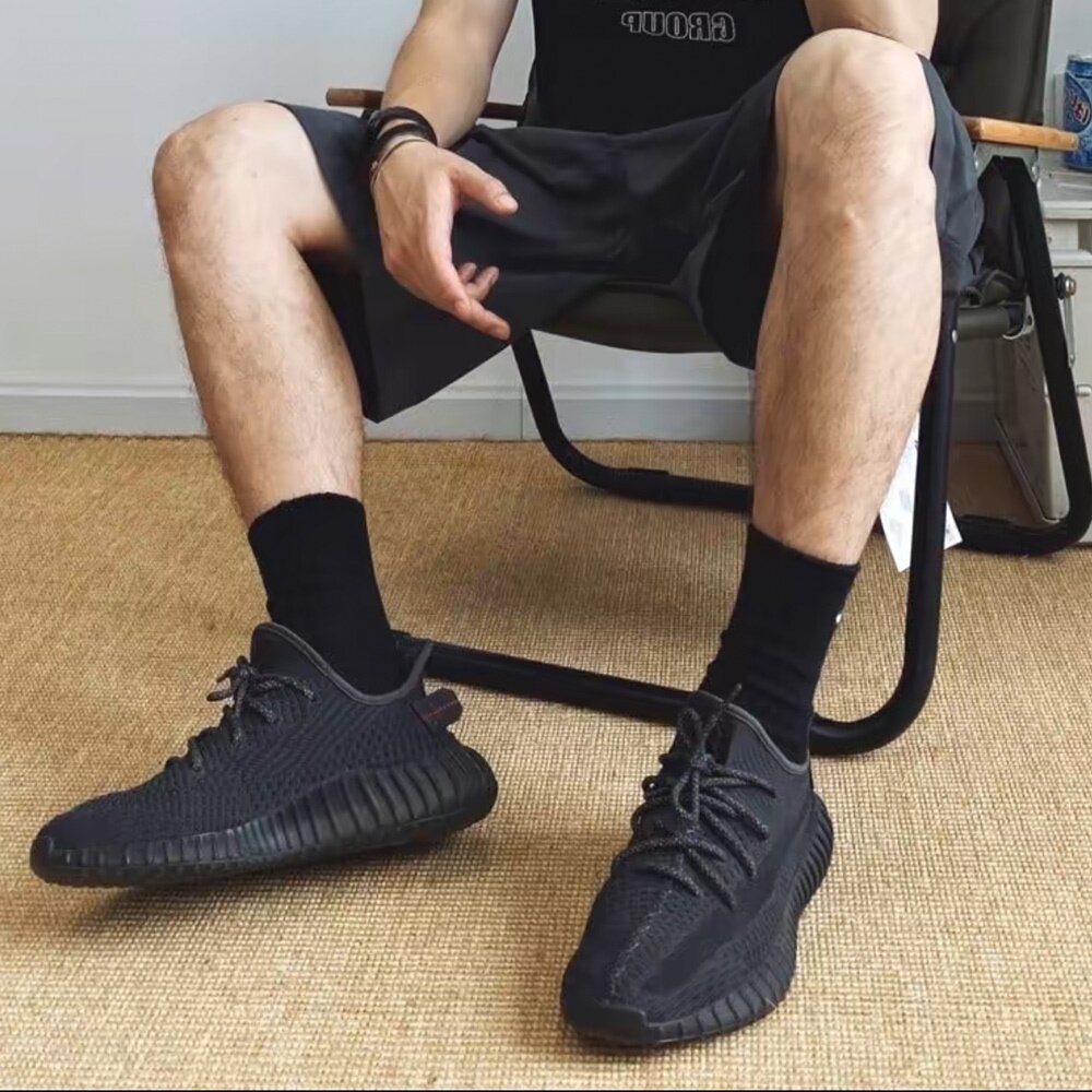 這款 Yeezy Boost 350 V2 配有黑色鞋面、黑色中底和黑色鞋底。