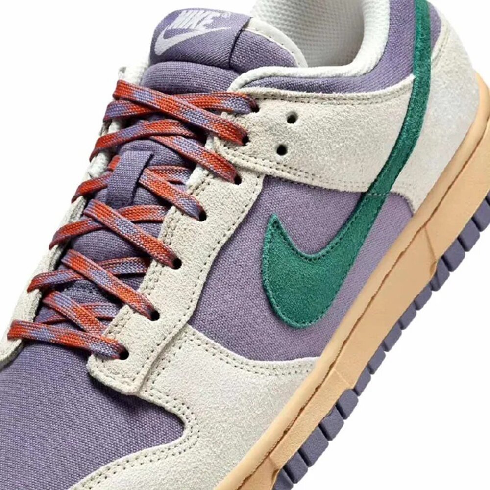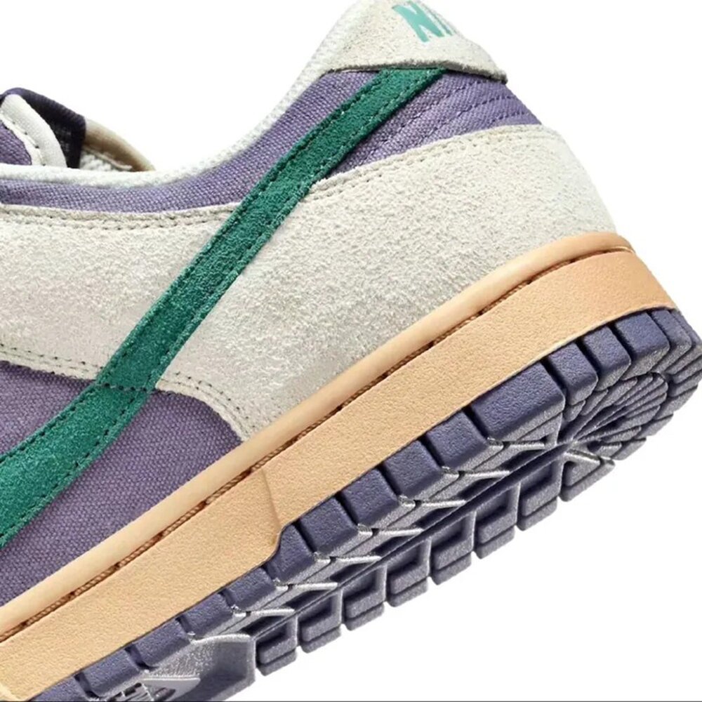 雖然不是 DC x Nike Dunk 的官方合作款,但紫色/綠色配色以非凡的保真度捕捉到了深受喜愛的超級反派的精髓。整體色調近似人氣角色「Joker」,全鞋以帆布面料與麂皮材質組成,配色上採用「Purple」和「Light Grey」做主軸,兩側的麂皮 Swoosh Logo 與鞋後跟的 Nike 字樣輔以「Green」點綴,鞋帶則以「Purple」和「Red」交錯打造,營造血跡斑斑的驚悚感,顏色的融合喚起了小丑的神秘和頑皮的精神,在運動鞋文化的畫布上創造了引人注目的視覺致敬。