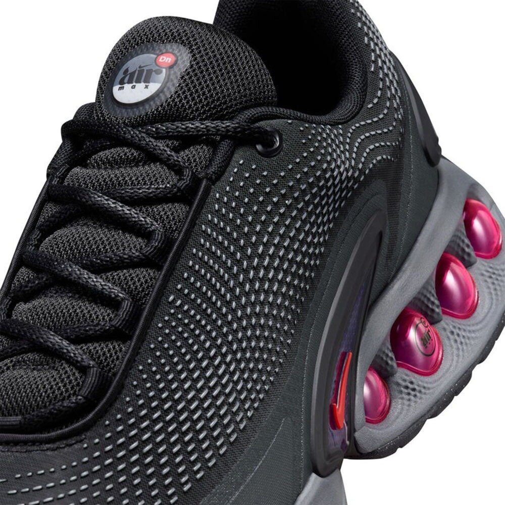 Nike Air Max DN「All Night」採用灰色注入式 Phylon 中底,搭配粉紅色 Dynamic Air 系統-雙室四管 Nike Air 裝置,位於後跟處。每一步,空氣在每個腔室的管子之間自由流動,提供平穩的過渡和舒適的乘坐體驗。鞋面採用黑色織物,配有觸覺紋理覆蓋層和 TPU 鞋跟穩定器。後者標有圓形 DN Air Max 徽章。