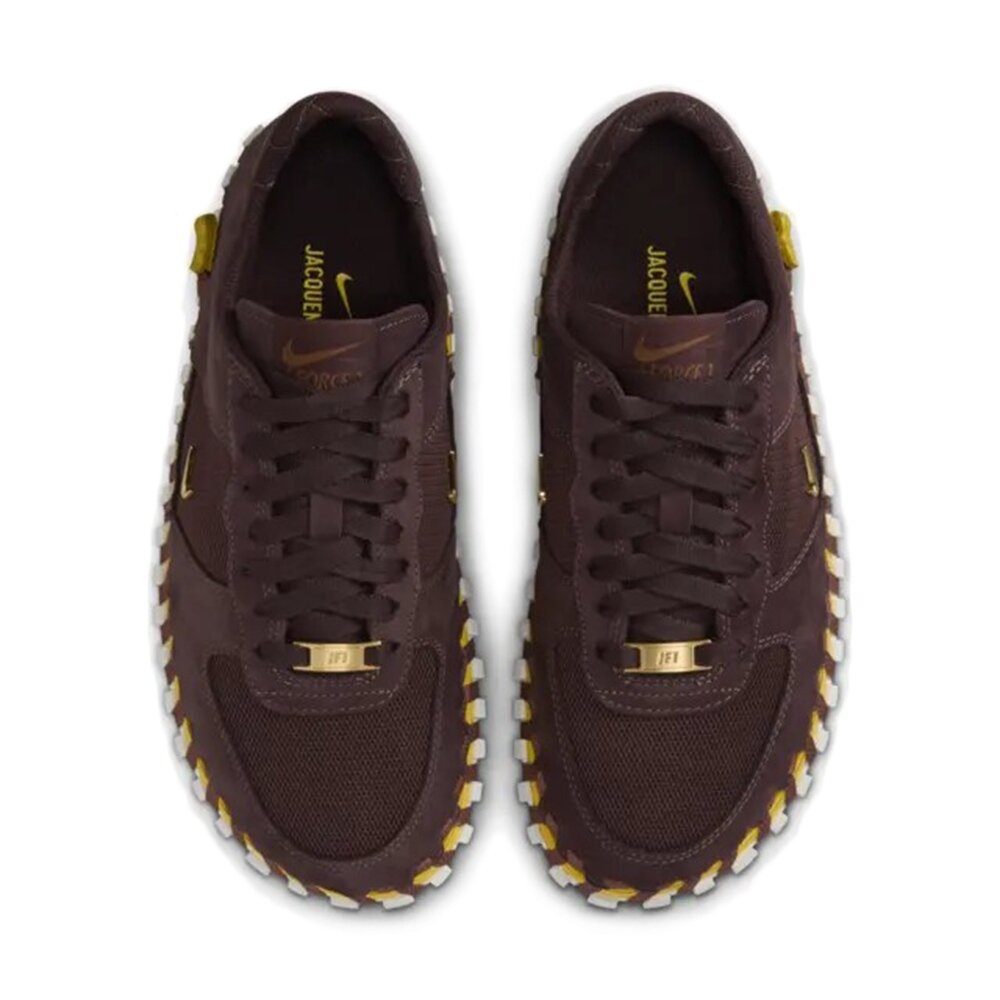 歡迎 J Force 1 精彩回歸。靈感來自同名運動鞋,Nike 與當代超現實主義藝術家 Jacquemus 聯手打造精緻又帶有俏皮巧思的鞋款。改版的 AF1 從鞋面到鞋底都採用手工編織,打造出讓你隨時隨地都搶眼出眾的設計。而且這並不難:JF1 在鬆餅格紋鞋底採用倒置標誌,每次邁步皆令人驚豔,此外,也飾有低調的金屬 Swoosh 標誌和「JF1」飾標等奢華元素,增添高品味雅緻質感。飽滿的土褐配色以鮮豔的歷練黃為點綴,搭配胡桃棕織帶和乳白色外底,營造不失優雅的運動時尚造型。