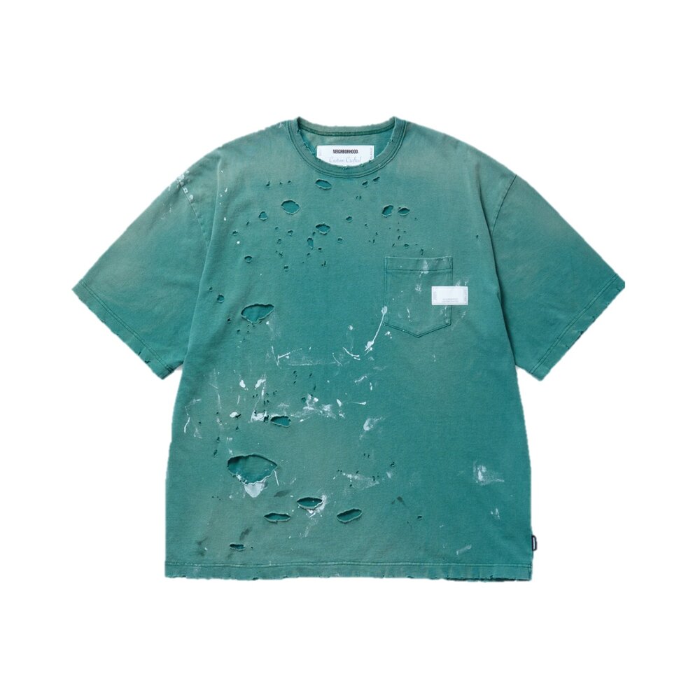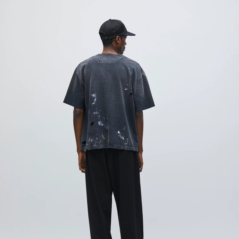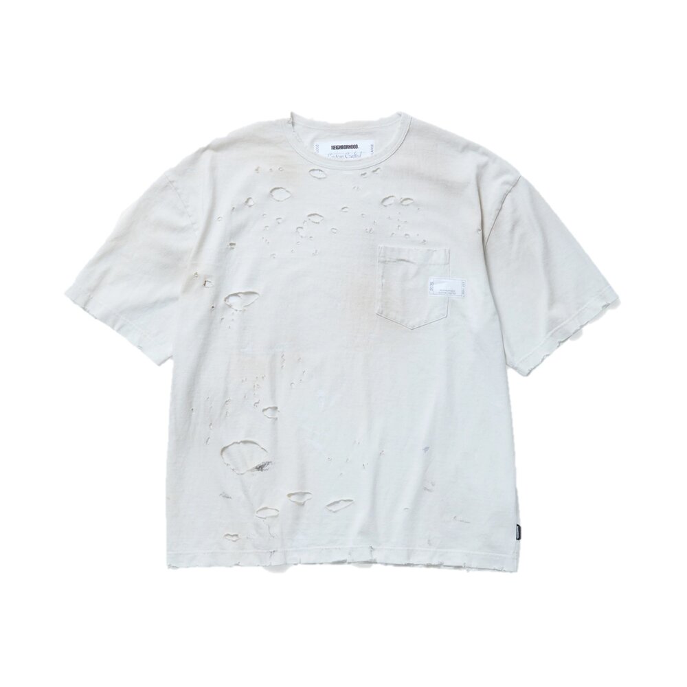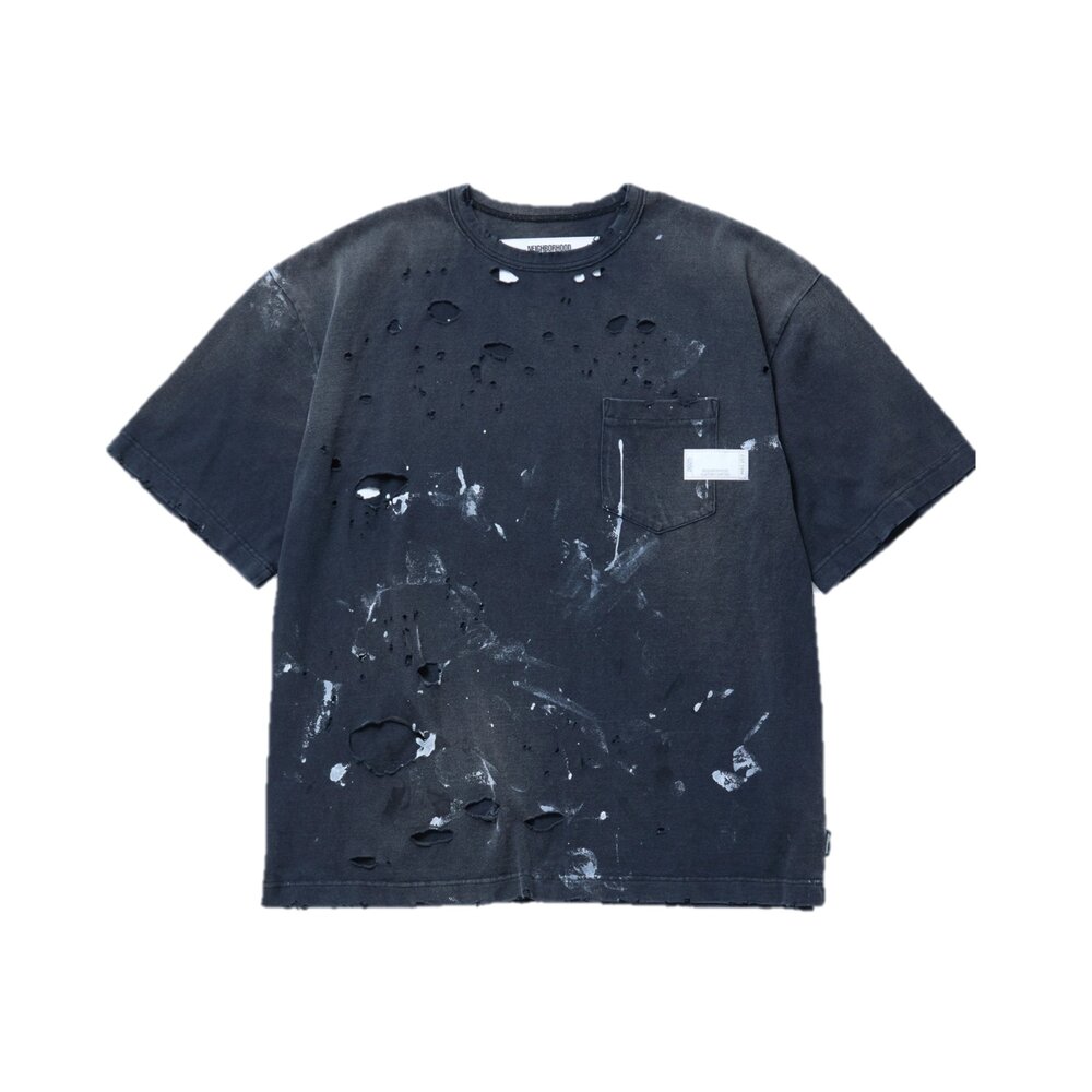 短袖圓領,口袋由褪色平紋針織製成,具有野蠻質感。使用褪色、漂白、損傷等的復合過程來應用逼真的老化效果。