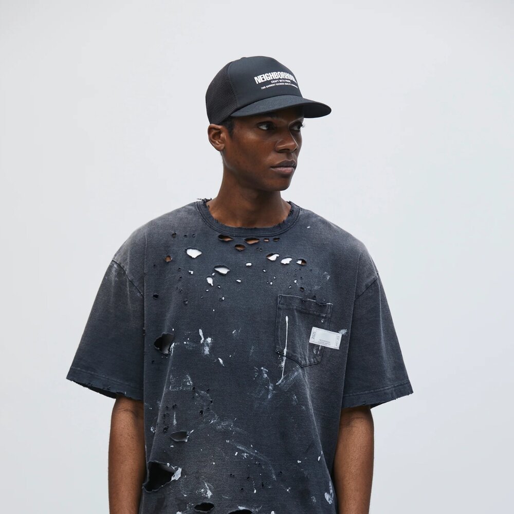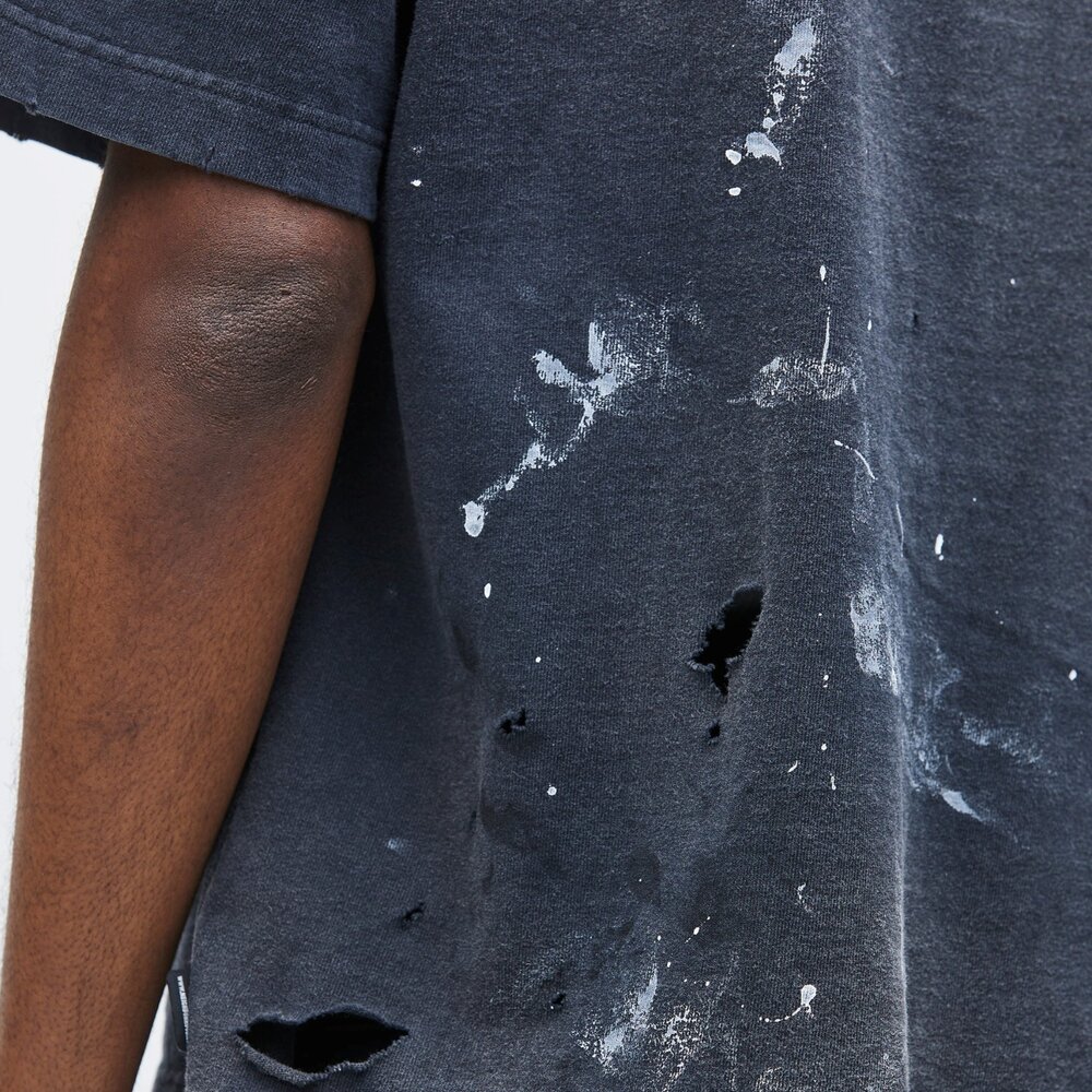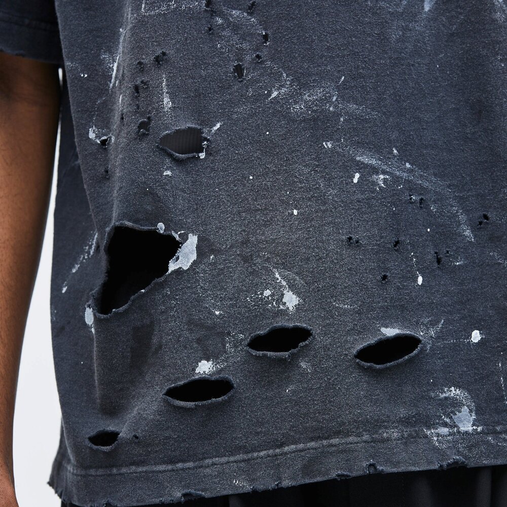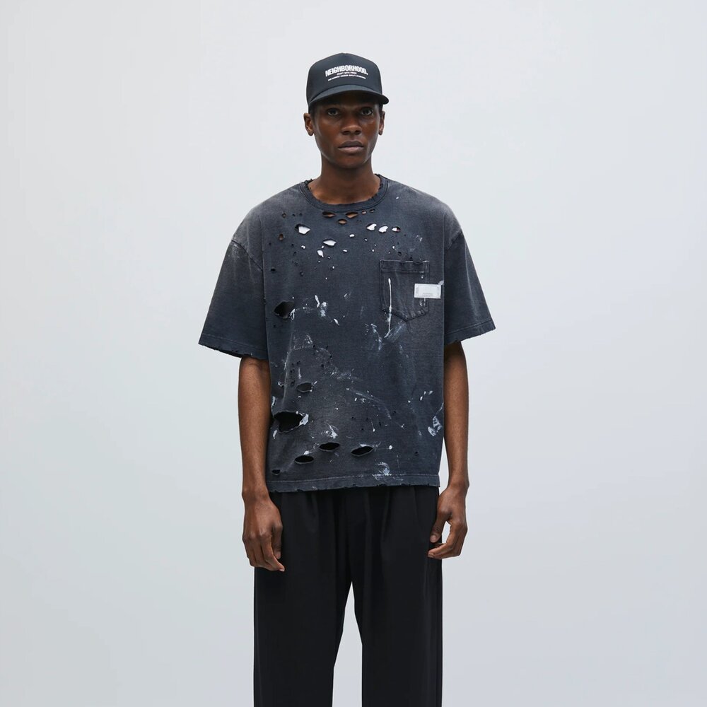 短袖圓領,口袋由褪色平紋針織製成,具有野蠻質感。使用褪色、漂白、損傷等的復合過程來應用逼真的老化效果。