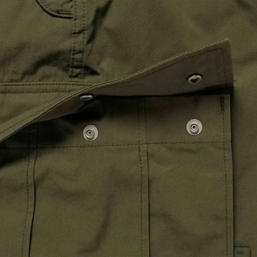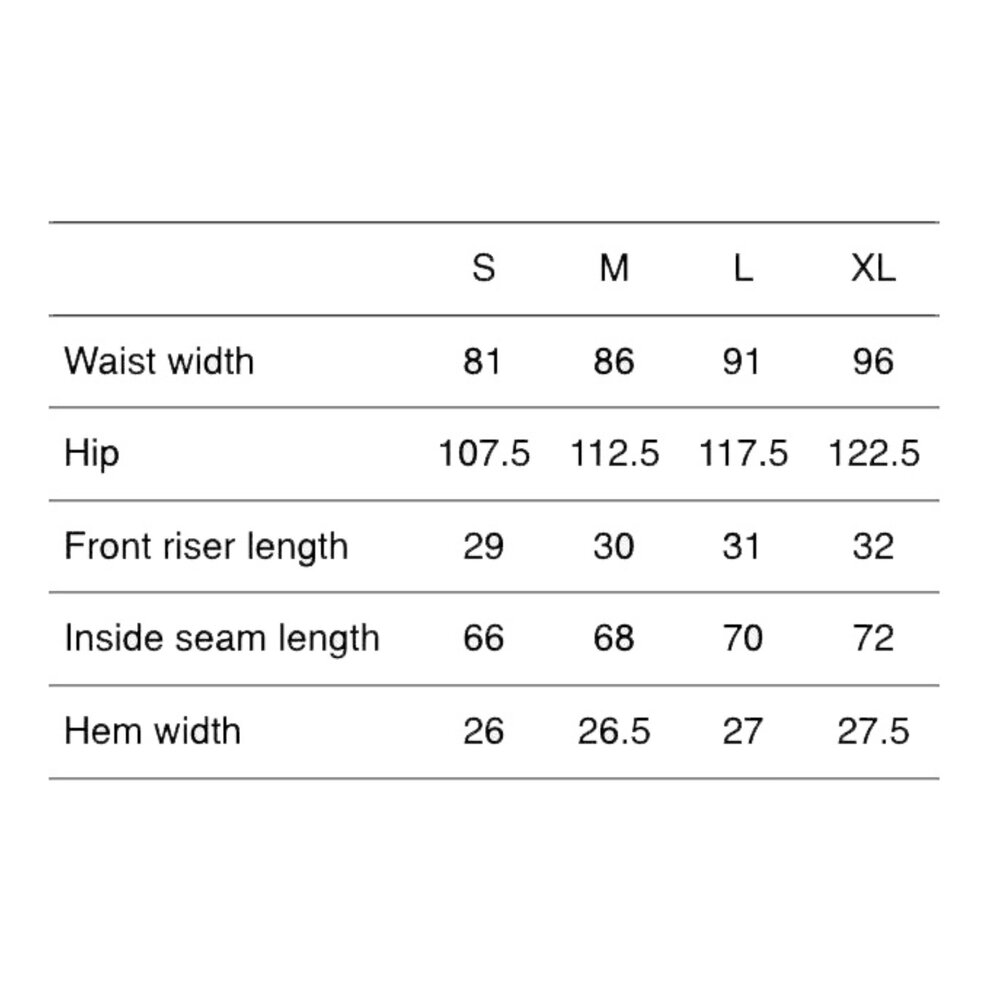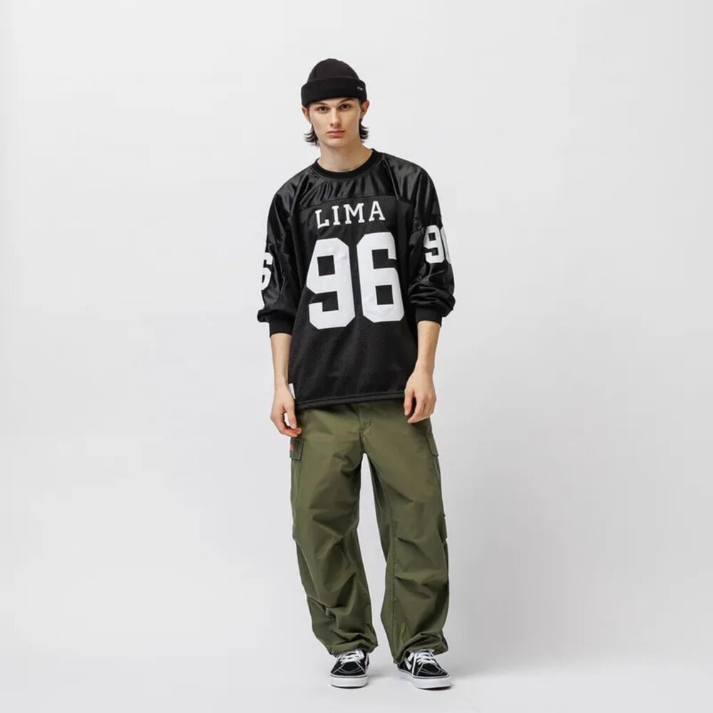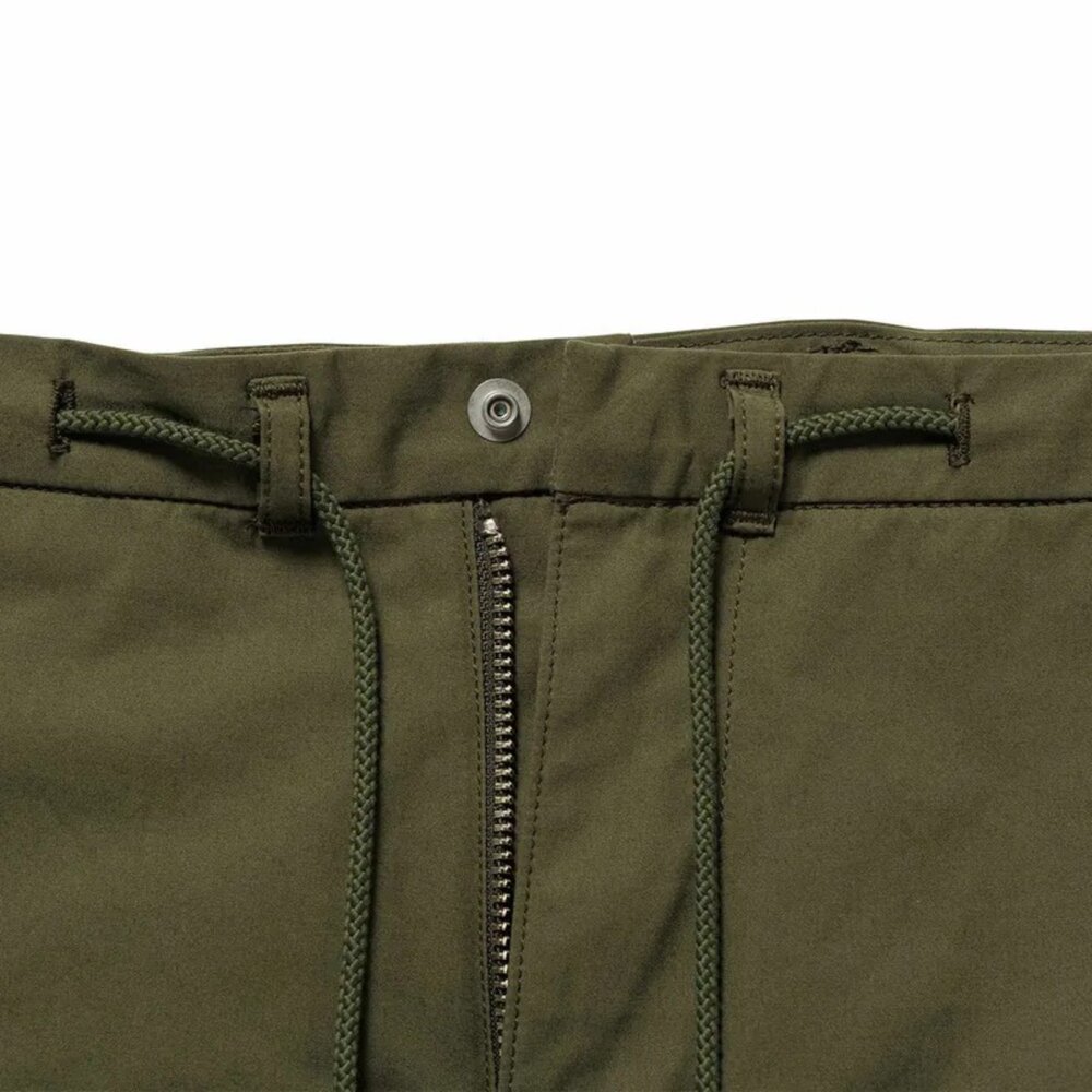 CORDURA® 尼龍的網眼面料,使用了六個口袋的寬鬆褲。在右側邊緣有兩條線標示尺寸和品牌名稱。腰部和腿部內藏拉繩可調節。前面的膝部分會輔助活動。左側的卡片口袋上有三種組合標籤。