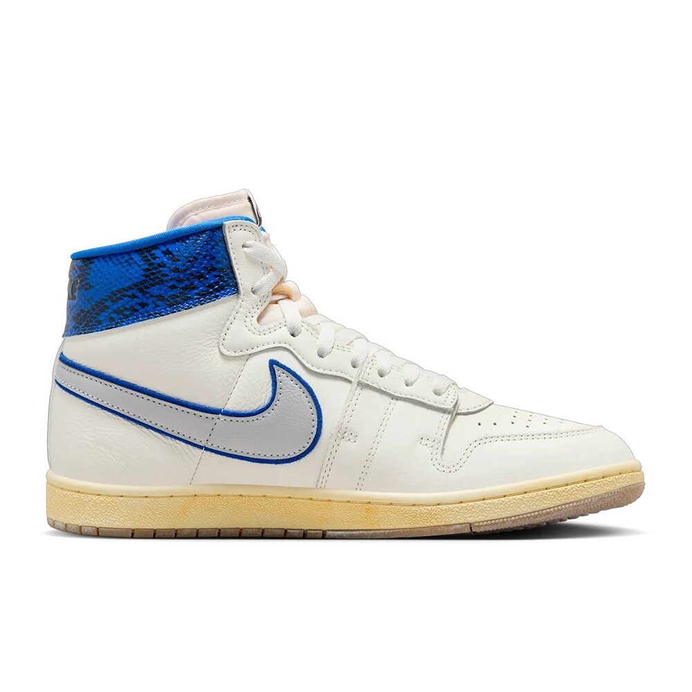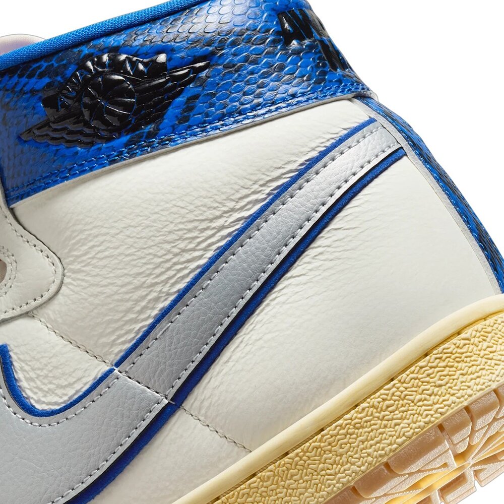 Jordan 傳統深植於紐約市,Michael Jordan 的出生地跟 Jordan 品牌的發展有著絕對的關聯性,本次與 Awake NY 聯名合作,就是要致敬這段淵源。在 AJ1 出現前,Michael Jordan 穿著的是 Jordan Air Ship,於是我們向此根源致敬。此版本混搭乳白色皮革鞋面與湛藍色蛇皮裝飾,並將金屬白金色 Swoosh 層疊在湛藍色 Swoosh 之上。深具歷史意義的布魯克林湛藍色調,彰顯這雙鞋款的 MJ 根源。這款 Air Ship 也採用品牌標誌,包括品牌聯名鞋舌標籤,擋泥罩縫有 Awake NY 的招牌「A」標誌,鞋跟則飾有「Awake NY」的戳印。最後以專屬包裝圓滿造型。