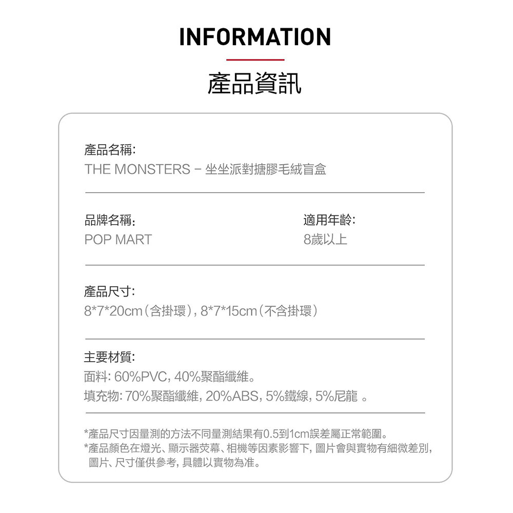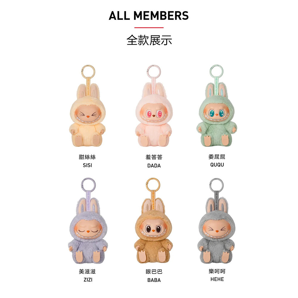 有機會開出隱藏款!單盒內共 6 種基本款 機率 1/6 + 隱藏款機率 1/72 面料材質:60% PVC、40% 聚酯纖維 填充物材質:70% 聚酯纖維、20% ABS,5% 鐵線、5% 尼龍 產品尺寸:8 x 7 x 20 cm ( 含掛環 );8 x 7 x 15 cm ( 不含掛環 )