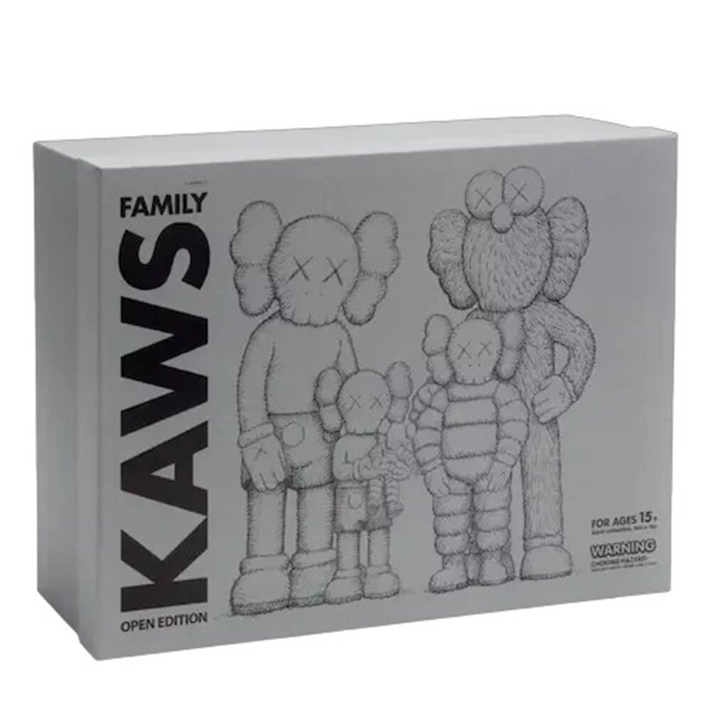 KAWS Family 人偶套裝包含流行的 Chum、Companion 和 BFF 人偶並排站在一起。粉紅色和灰色調的人偶展示了兩個同伴人偶,其中一個抱著一個小 Chum 角色,而另一側則展示了一個 13.3 英寸的 BFF 人偶,手臂環繞著 Chum 角色。
