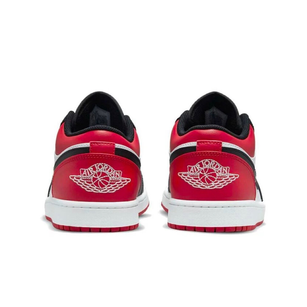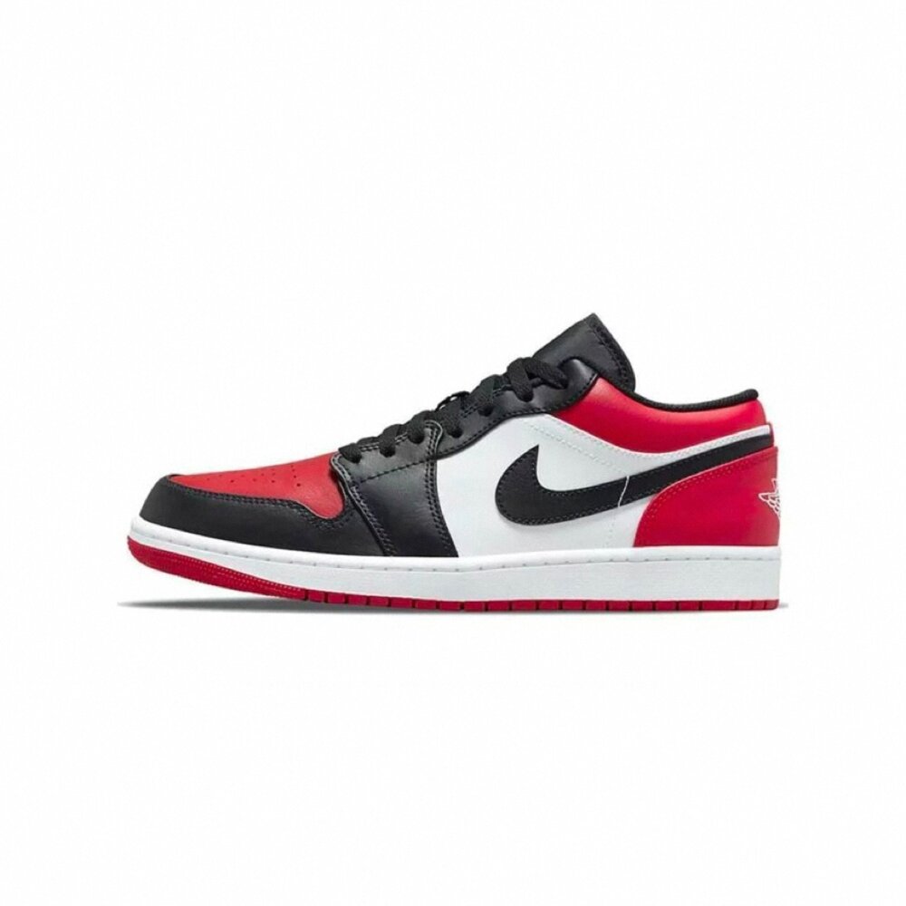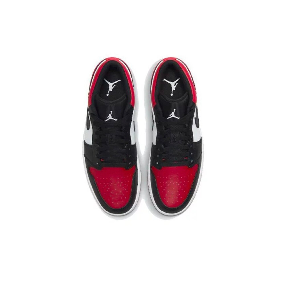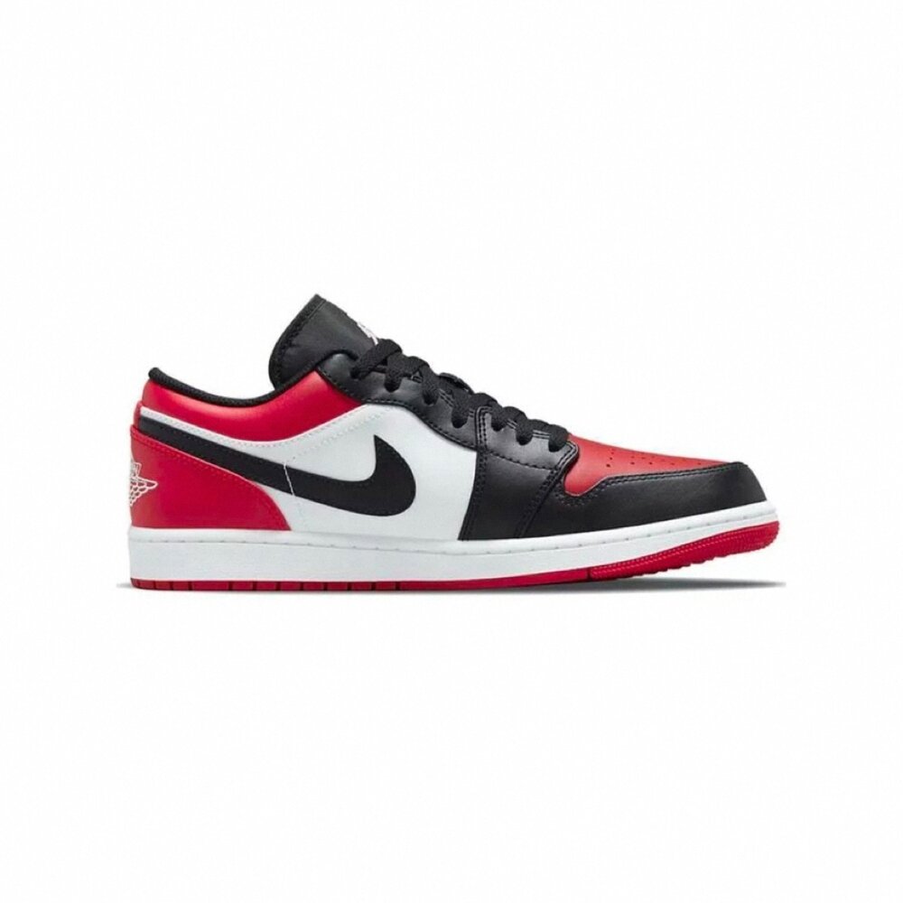 Jordan 1 Low Bred Toe 從 2018 Air Jordan 1 High Bred Toe 中汲取靈感,採用標誌性的黑色和紅色拼色。鞋面由白色、黑色和紅色皮革組成,黑色和紅色皮革覆蓋鞋面、對勾和後跟,而白色皮革在四分之一鑲板上非常顯眼。加上鞋跟的刺繡 Wing 翅膀標誌,和編織鞋舌的 Jumpman 標誌,構成了這雙鞋的設計。