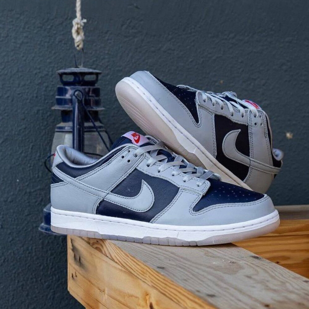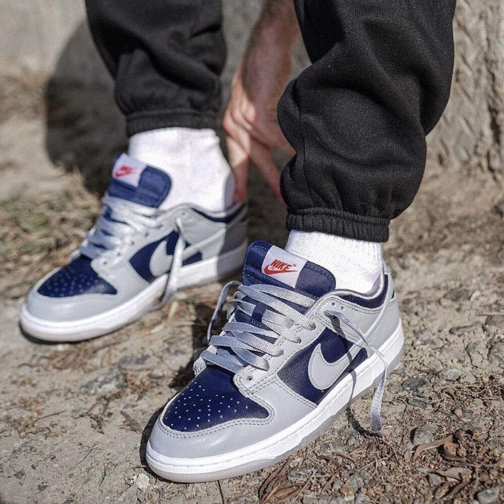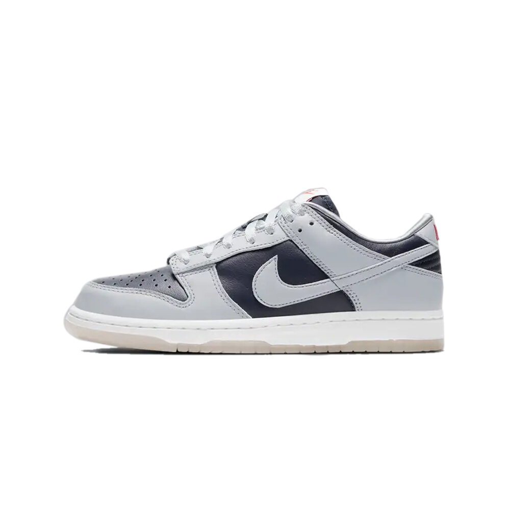 秉承瘋狂三月的精神,Nike 推出女子專屬 Nike Dunk Low College Navy (W) 向喬治城大學霍亞斯分校致敬。霍亞斯隊 (Hoyas) 是 NCAA 歷史上最著名的籃球項目之一,也是最早獲得 Swoosh 贊助的項目之一。女款 Nike Dunk Low College Navy (W) 鞋面採用大學海軍藍和狼灰皮革製成。學院海軍藍構成腳趾、內側和腳踝,而狼灰色構成覆蓋層、鞋面和 Swoosh。編織鞋舌標籤和鞋跟標誌上的紅色元素十分醒目。白色中底和淺灰色半透明外底完成了配色。