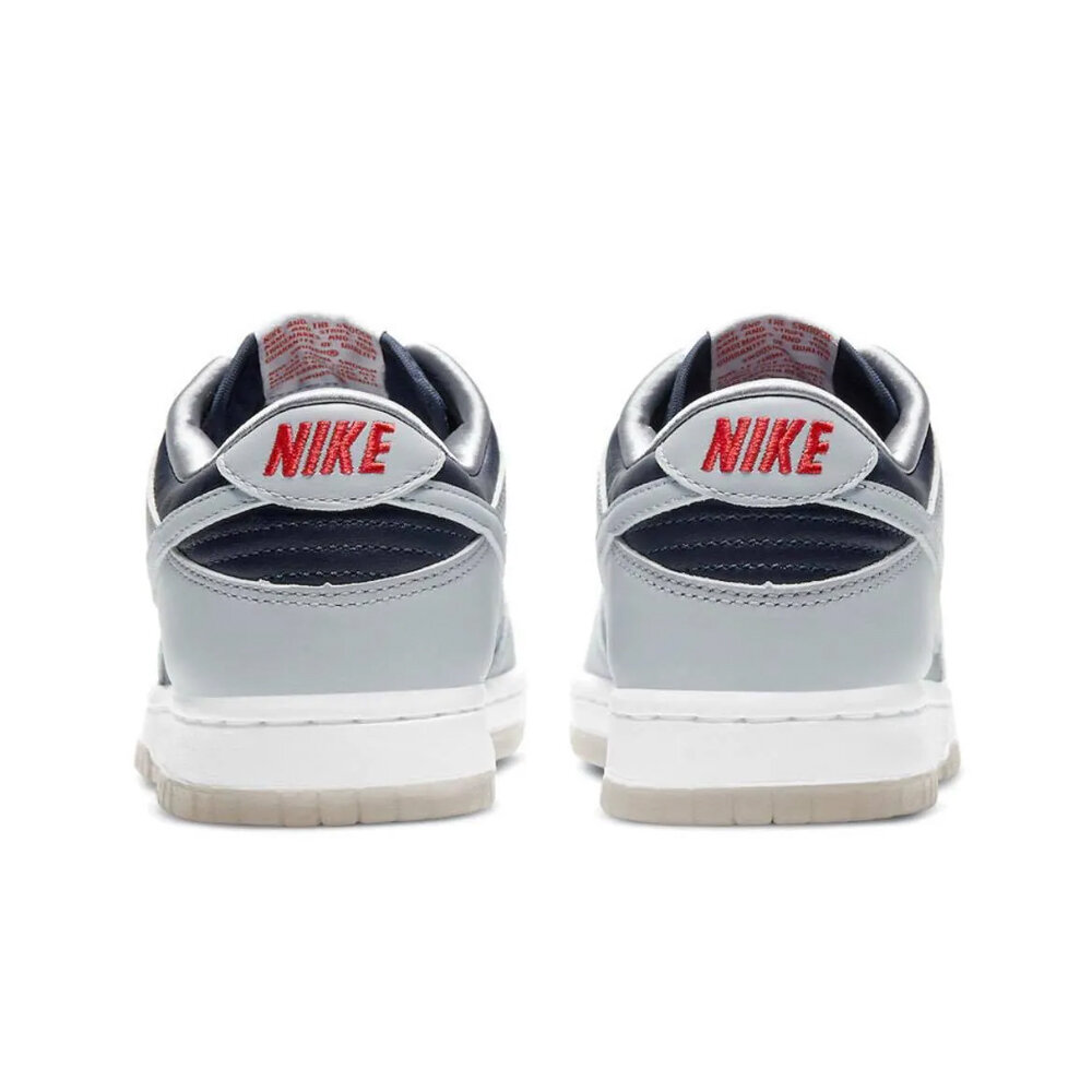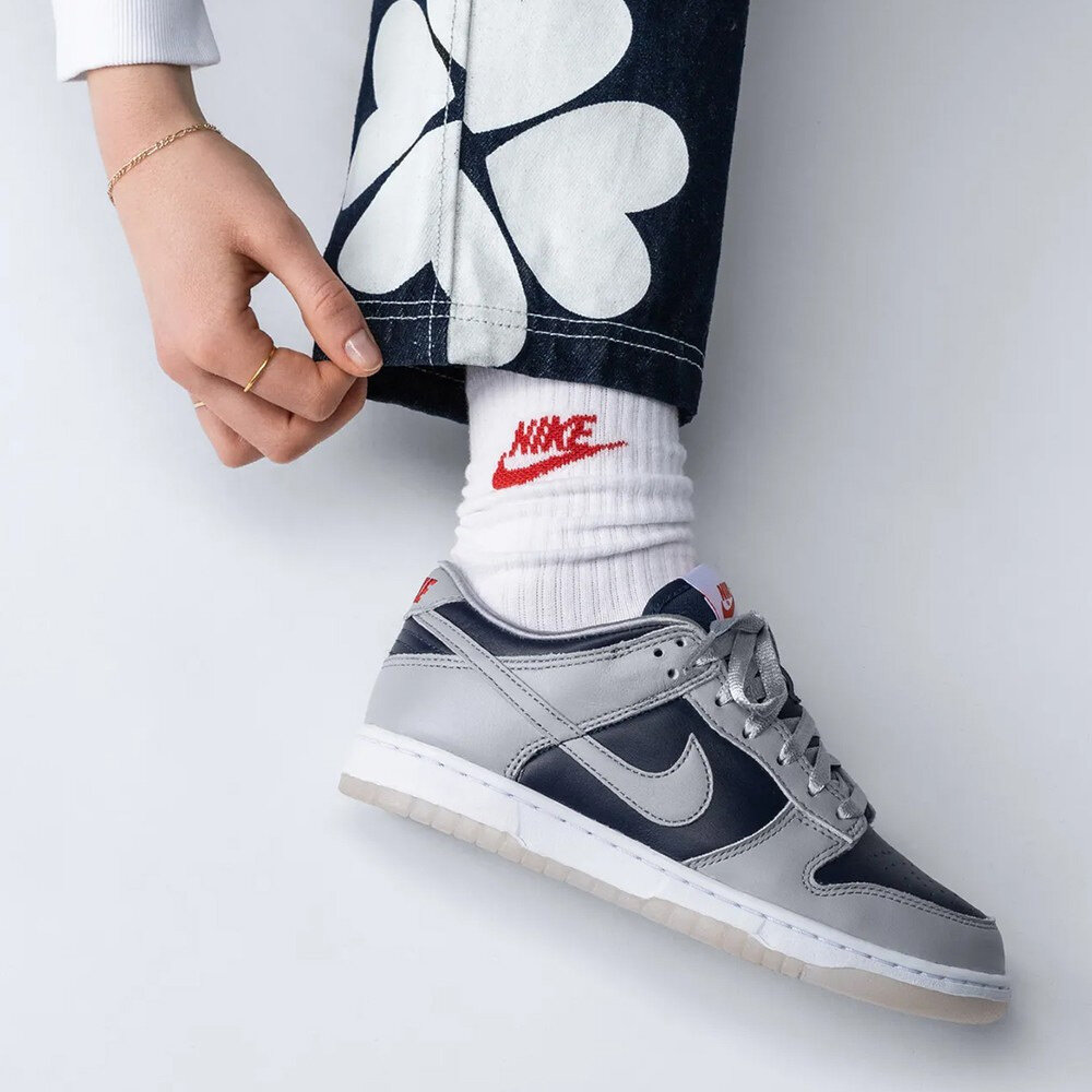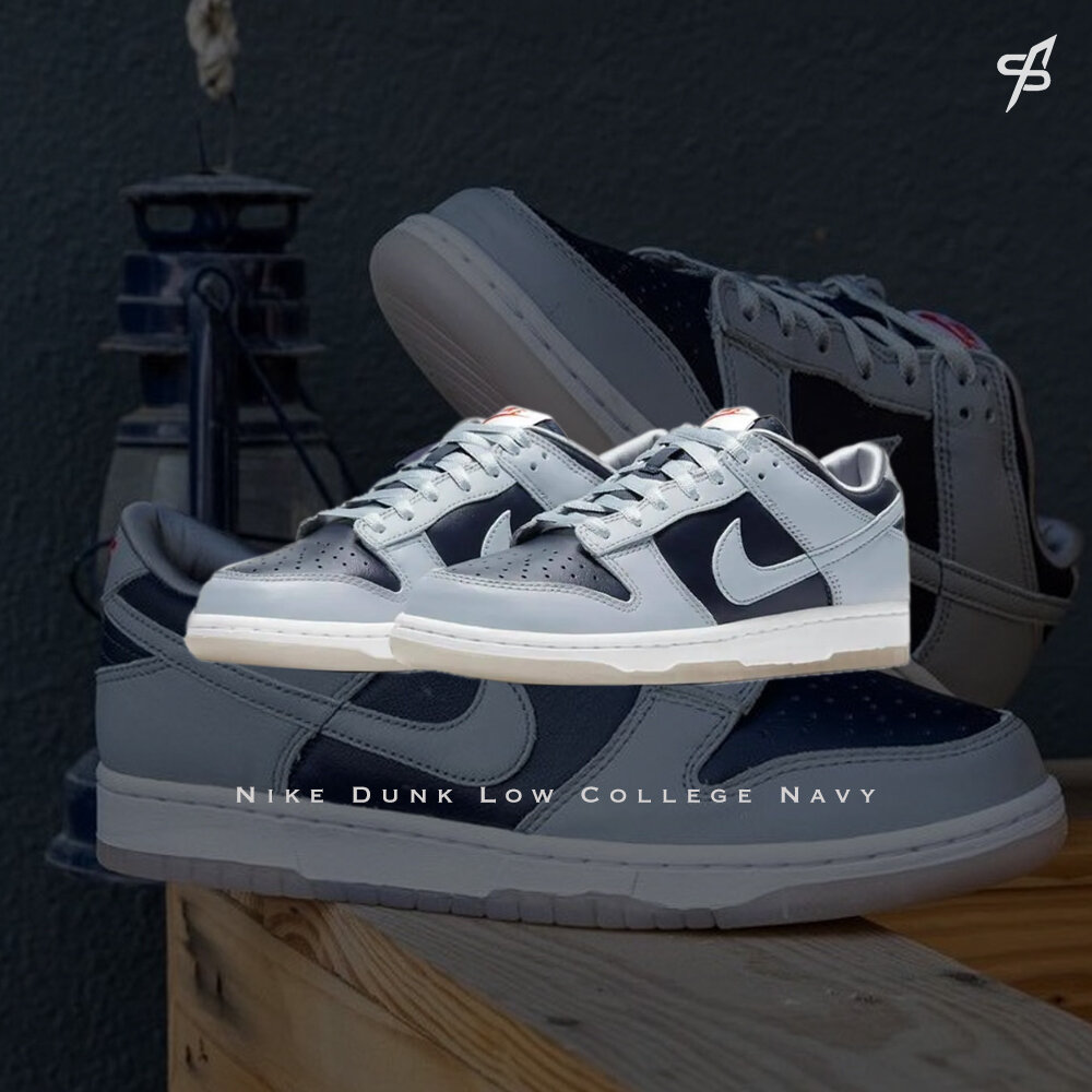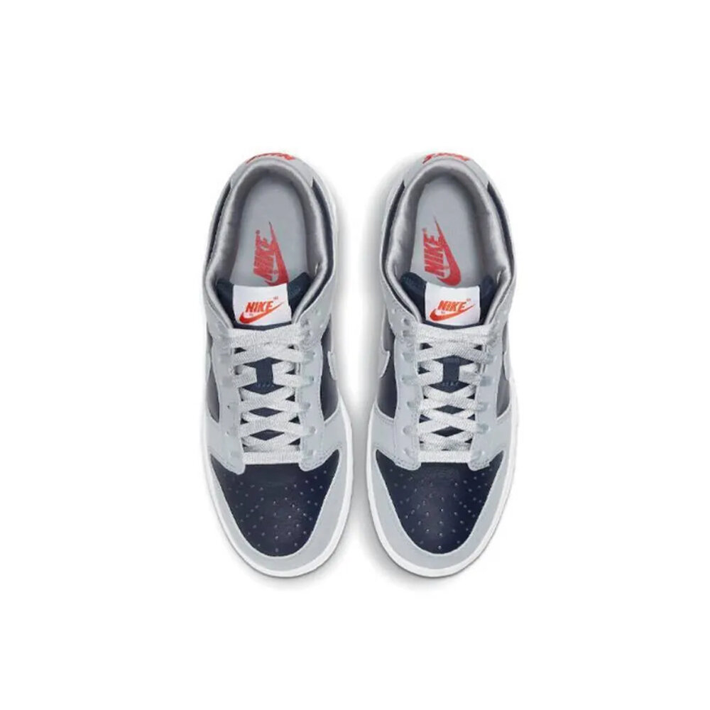 秉承瘋狂三月的精神,Nike 推出女子專屬 Nike Dunk Low College Navy (W) 向喬治城大學霍亞斯分校致敬。霍亞斯隊 (Hoyas) 是 NCAA 歷史上最著名的籃球項目之一,也是最早獲得 Swoosh 贊助的項目之一。女款 Nike Dunk Low College Navy (W) 鞋面採用大學海軍藍和狼灰皮革製成。學院海軍藍構成腳趾、內側和腳踝,而狼灰色構成覆蓋層、鞋面和 Swoosh。編織鞋舌標籤和鞋跟標誌上的紅色元素十分醒目。白色中底和淺灰色半透明外底完成了配色。