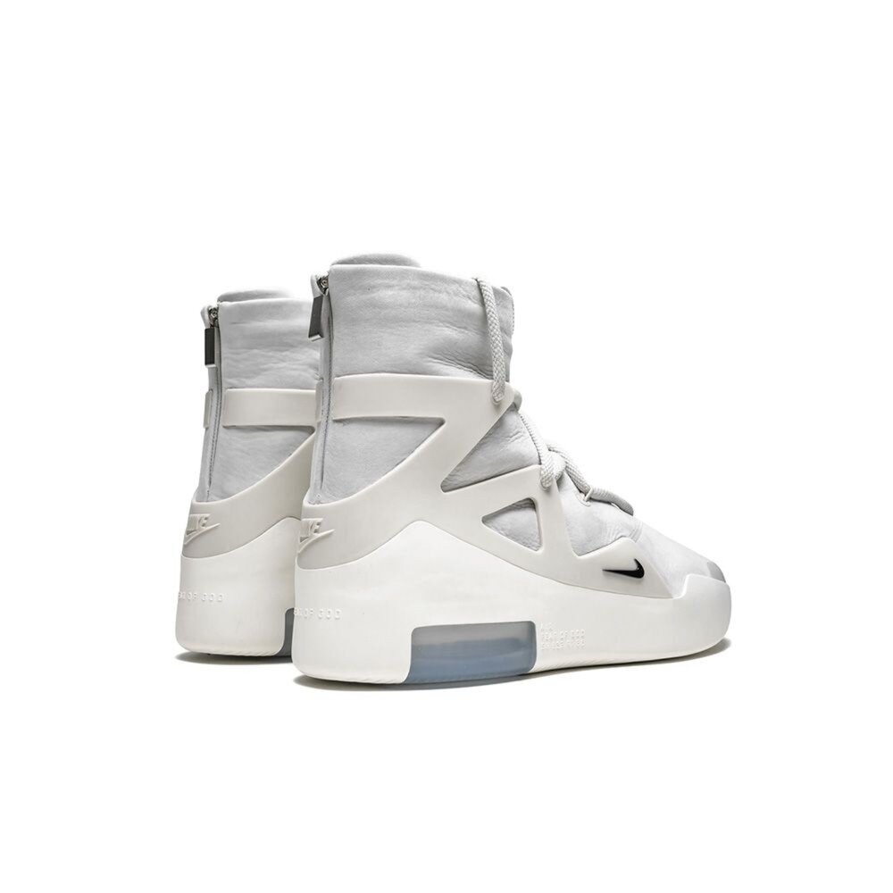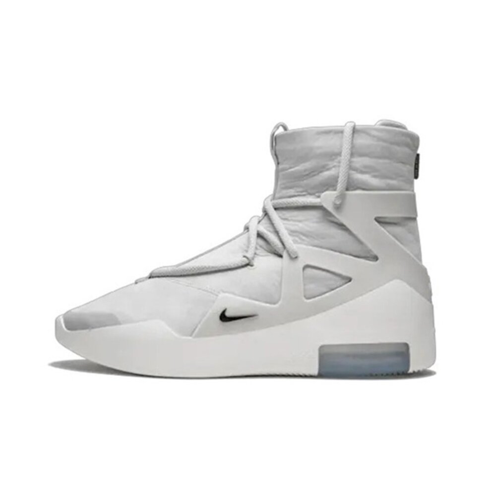 以軍靴元素與前衛感球鞋風格結合,從 Jerry Lorenzo 的觀點立場去設計出一雙切合運動員舒適度的籃球鞋款。以淺灰和黑色分展兩雙的 Air Fear of God 1,採用質感極佳皮革與透氣網眼構成鞋身,幾何造型的 TPU 支架取自經典 Huarache Light,而帶有三角線條並內植有透明雙層 Zoom Air 氣墊的白色大底顯得更加引人注目,是借鑑 Air Max 180 的可視氣墊設計。