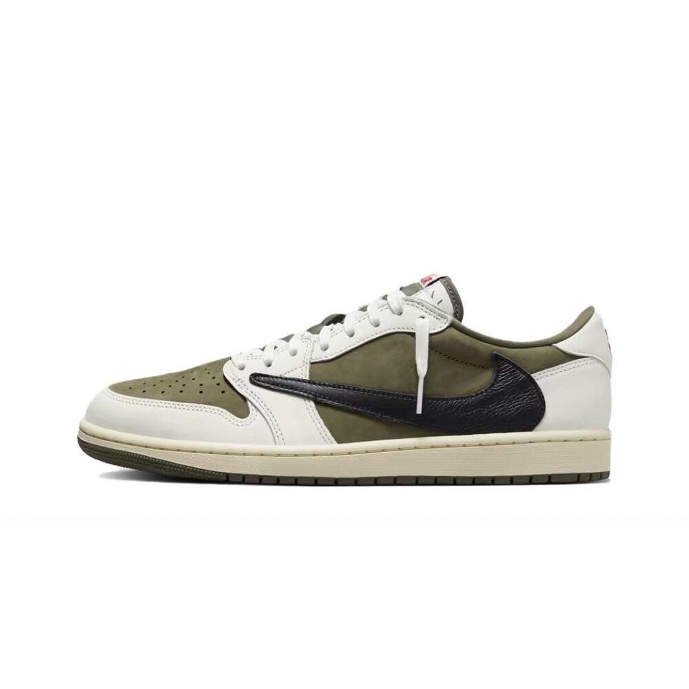 Travis Scott x Air Jordan 1 Low OG SP 'Medium Olive' 採用綠色絨面革底色,前掌和後跟區域飾有粉筆白色皮革覆層。Scott 的黑色翻滾皮革反 Swoosh 標誌裝飾側面,而紅色流行元素則觸及 Nike Air 鞋舌以及背面標籤上的 Wings 和 Cactus Jack 標誌。這款運動鞋採用米白色中底,由堅固的橄欖橡膠外底加固。