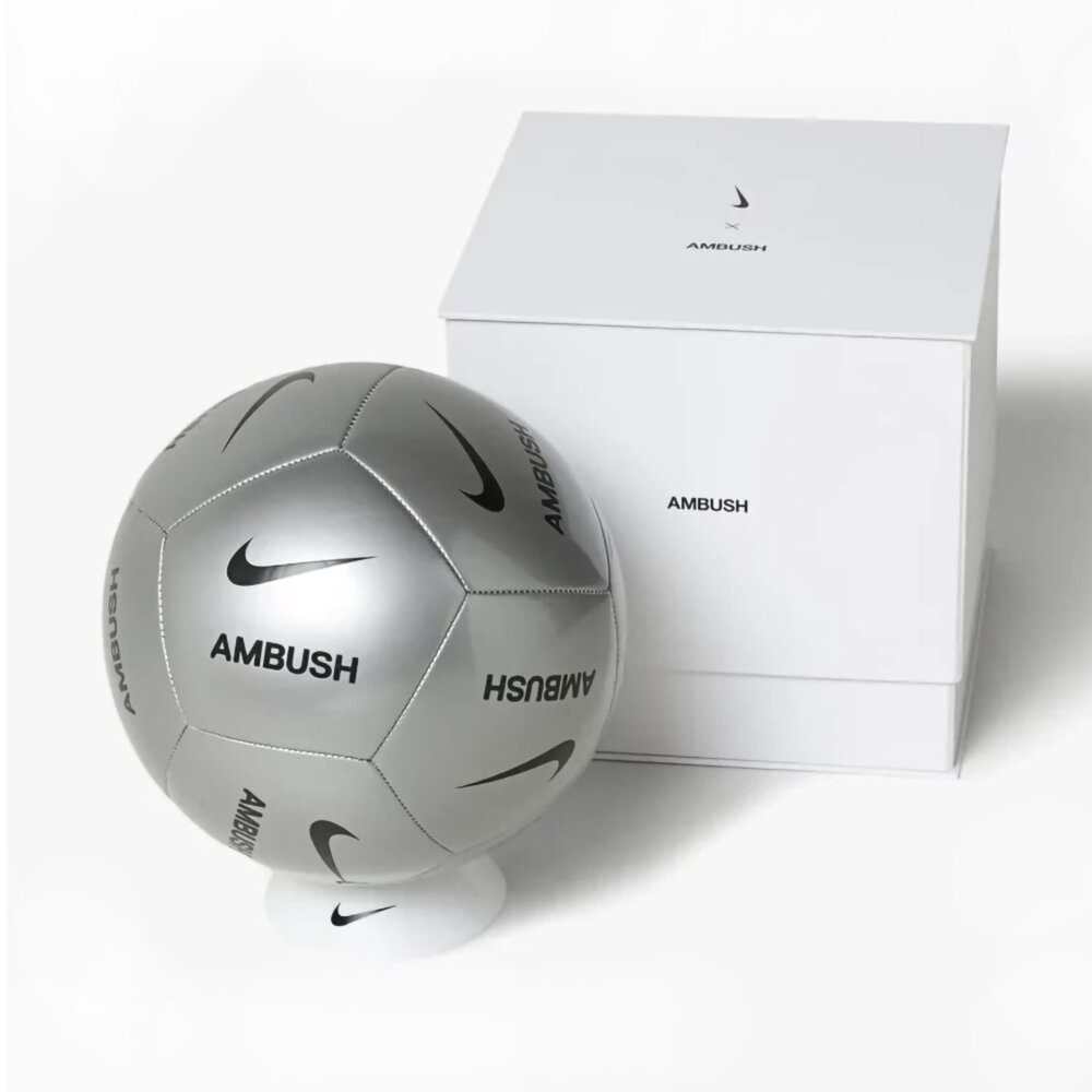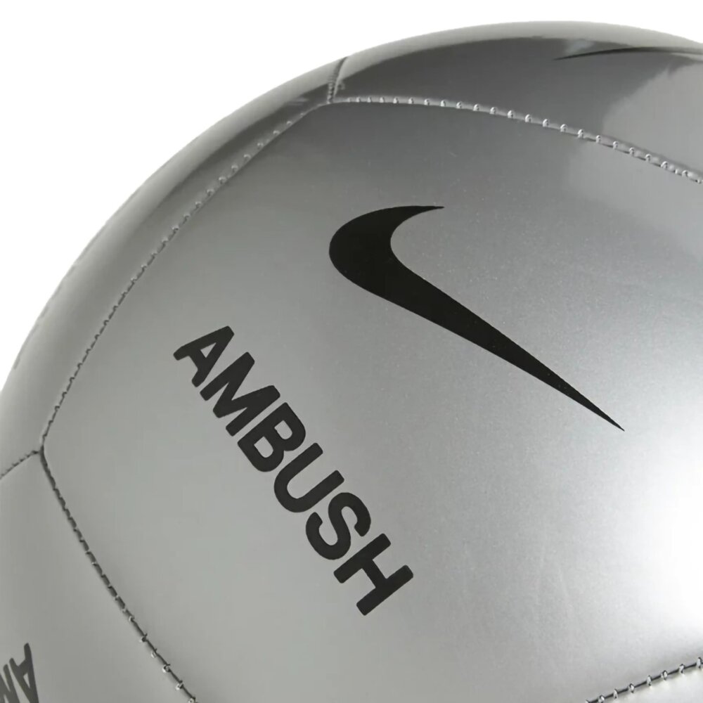 Nike x AMBUSH Pitch足球採用金屬銀色處理。合作印刷的品牌標誌貫穿始終,起到畫龍點睛的作用。