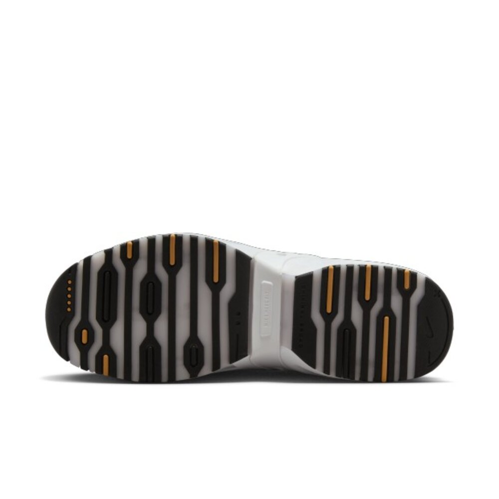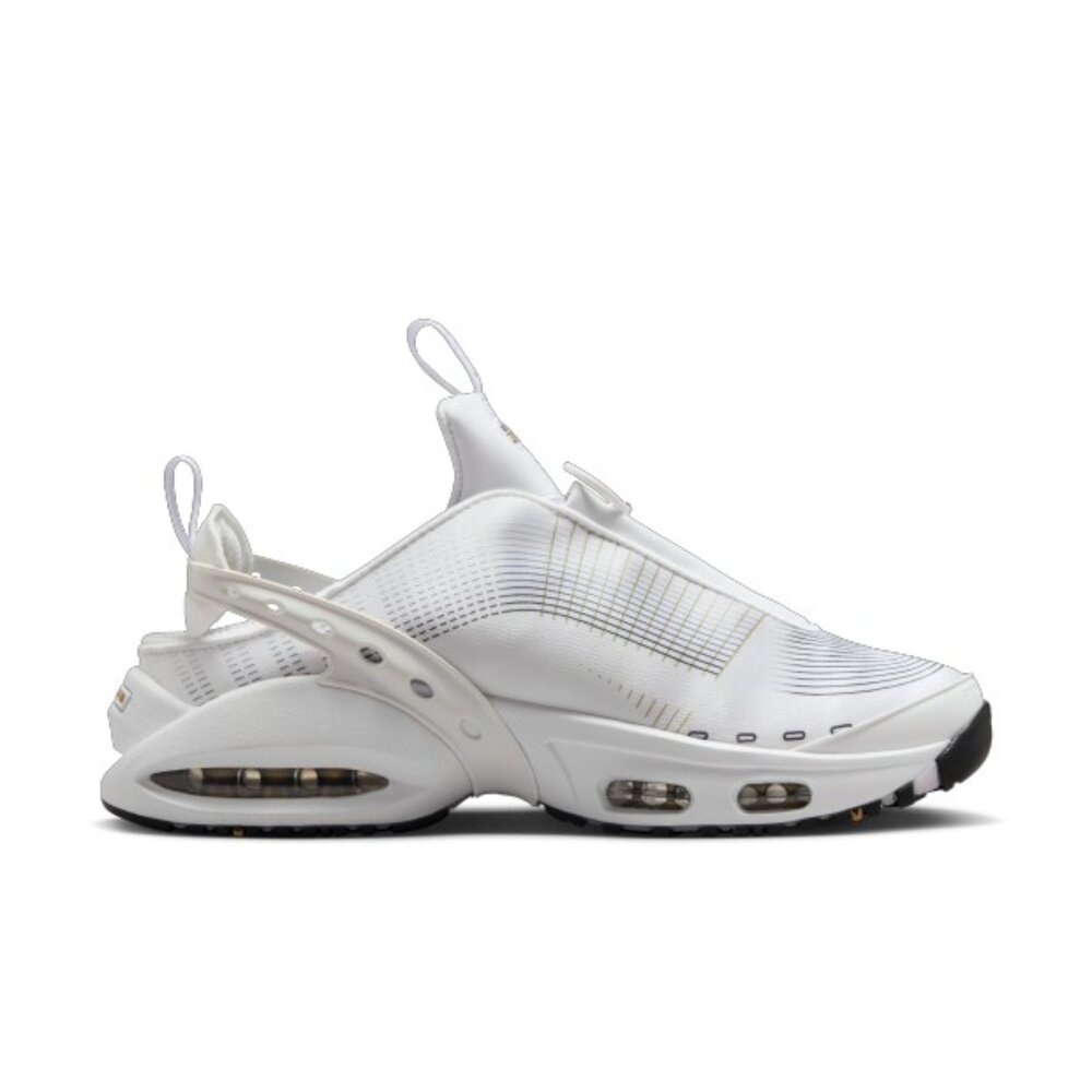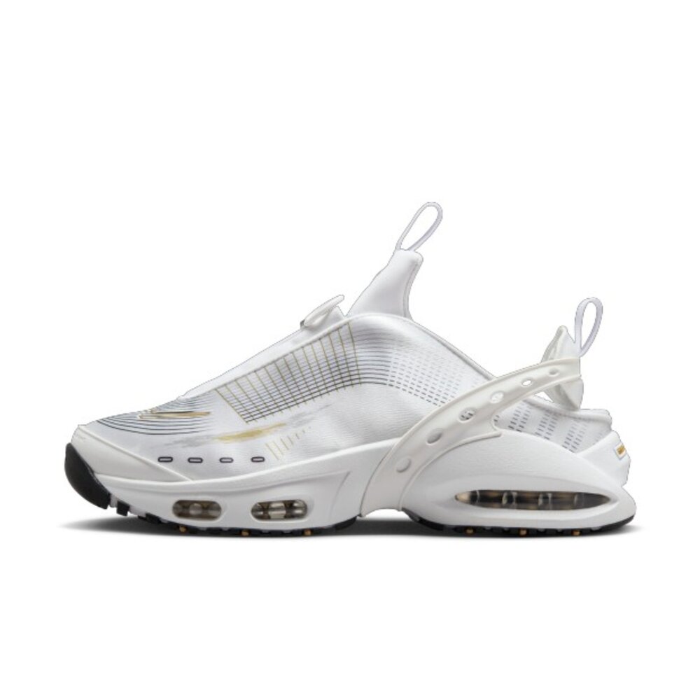此版本採用彈性鞋面,結合俐落的白色和亮金色。