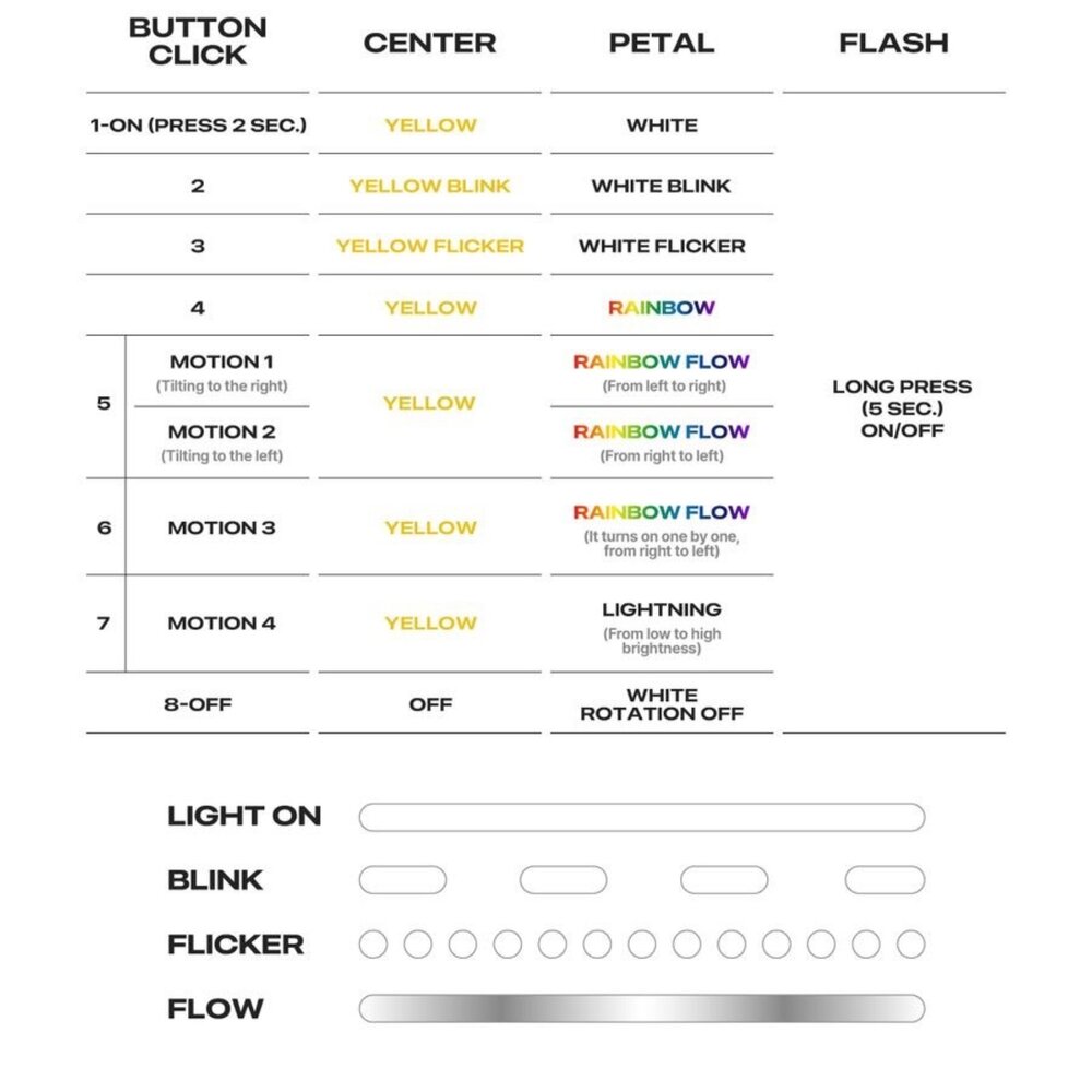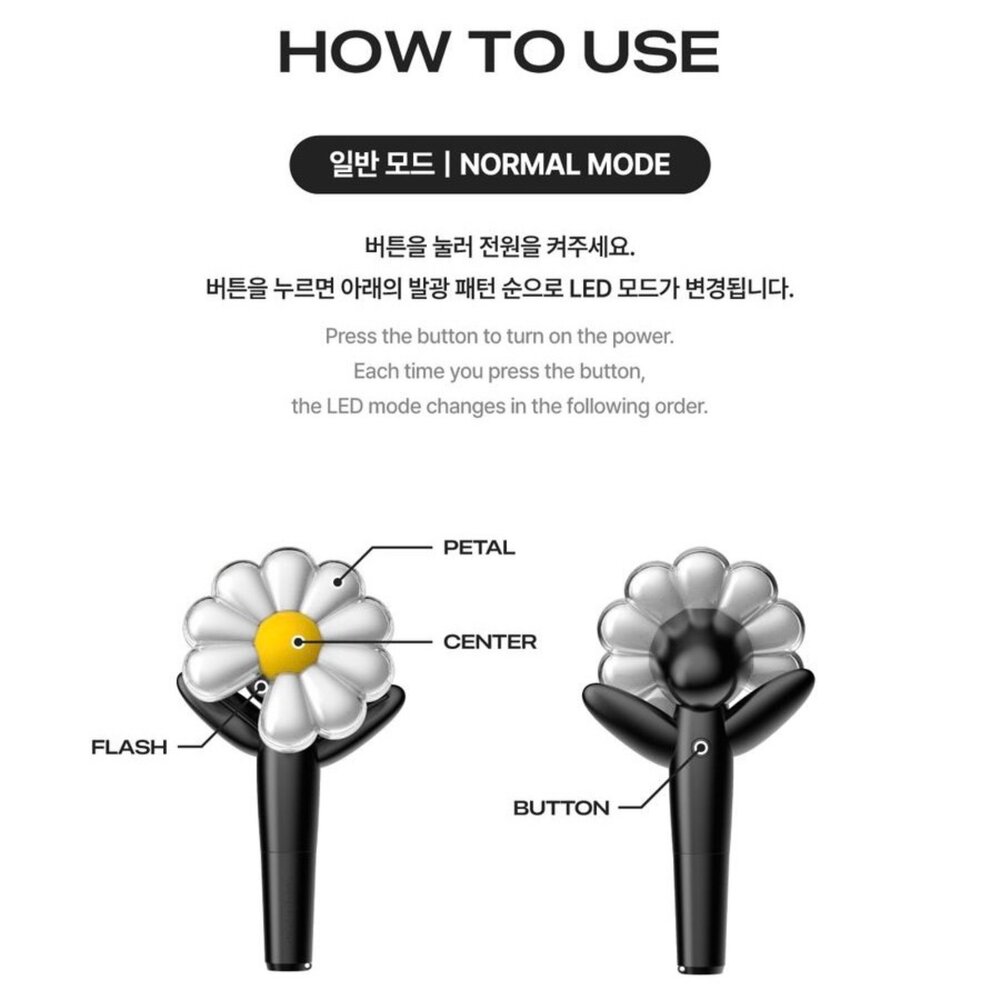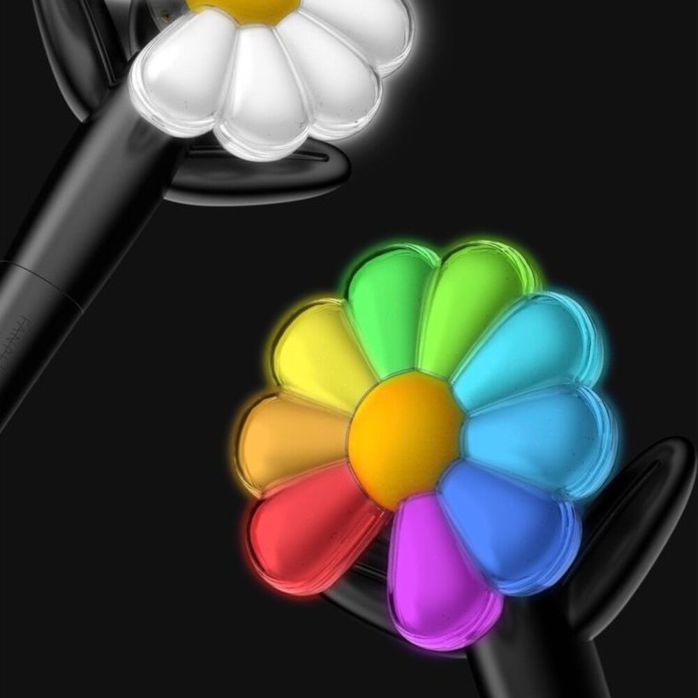 這款手燈不僅充滿了 G-Dragon 獨特的藝術風格,更以他個人品牌 PEACEMINUSONE 的標誌性「少一片花瓣的小雛菊」為靈感,設計感十足,讓人一眼就愛上!G-Dragon 官方粉絲社群首次公開了應援手燈的設計圖及發售說明,手燈本體以小雛菊為造型,搭配草地圖案的包裝盒。更令人驚喜的是,這款手燈附帶一個花盆造型支架,竟然是手燈的充電座!當手燈與花盆充電座合體時,瞬間變成了一盆可愛的小雛菊,既潮流又充滿童趣。