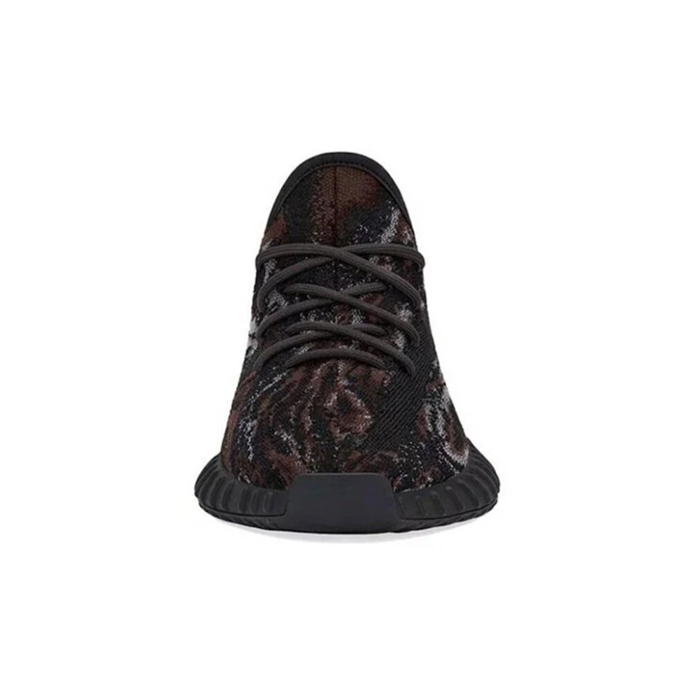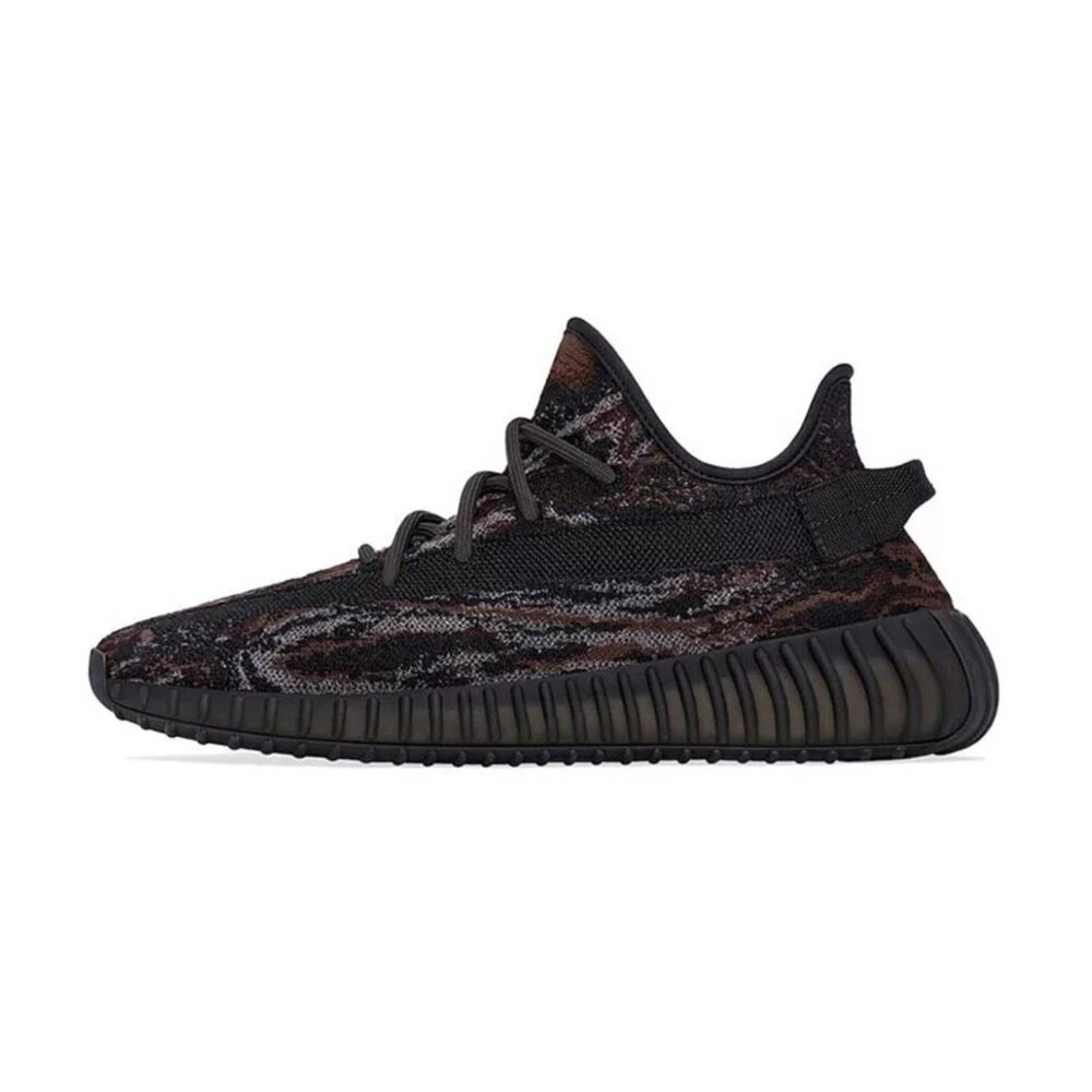 adidas Yeezy Boost 350 V2 MX Rock 球鞋採用大理石紋的黑色、灰色和棕色 Primeknit 鞋面,其圖案與 Yeezy 350 V2 MX Oat 相似,只是採用了深色調。緩震的 Boost 鞋底、鞋跟標籤和網眼側條以標誌性的時尚設計完成。