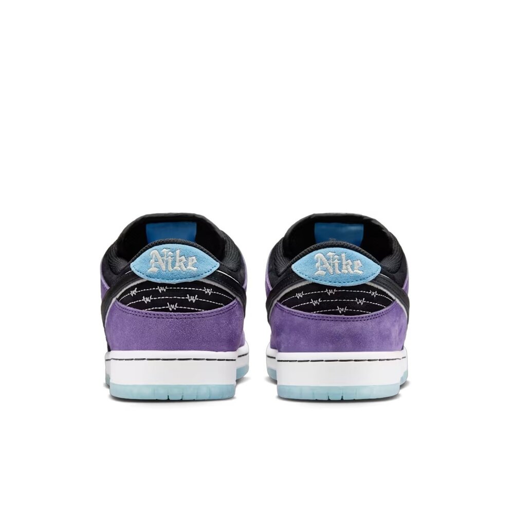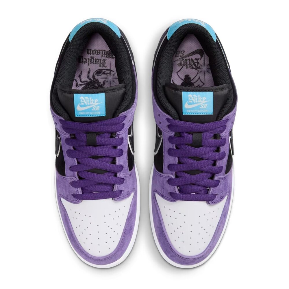 Hayley Dunk 鞋款融合了大膽的紫色、刺青風格圖案與細緻的陰影處理,在俐落線條與柔和色調之間達到巧妙平衡。大部分的設計圖案靈感源自 Hayley 本人的刺青。掀起鞋舌,還會發現她的口頭禪「you reckon」(你說是不是?)。Hayley Dunk 鞋款採用高品質的磨砂皮和皮革製作,並在 Swoosh 標誌和鞋跟標籤周圍使用會在陽光下變色的紫外線反應紗線。刺繡鐵絲網圖案、半透明外底以及三組鞋帶,搭配不同顏色的鞋帶頭,增添個性與精緻感。