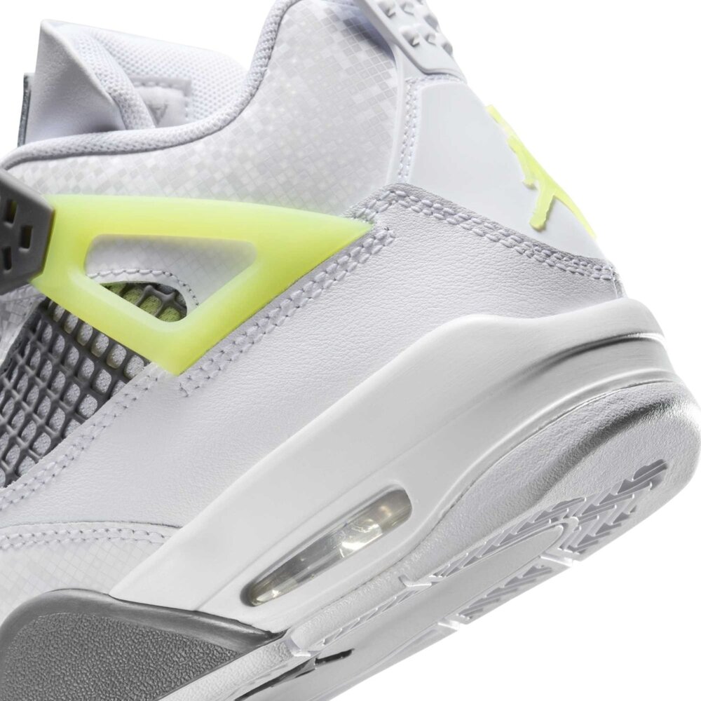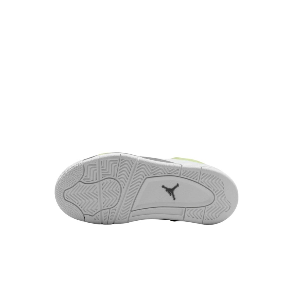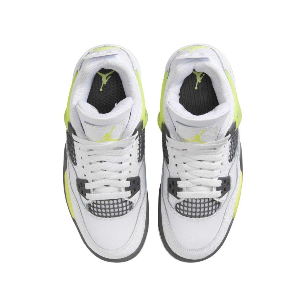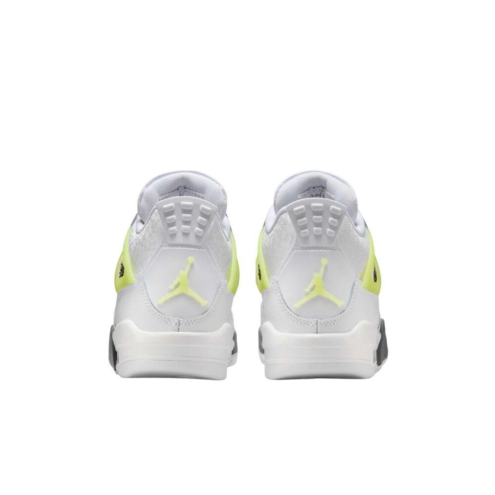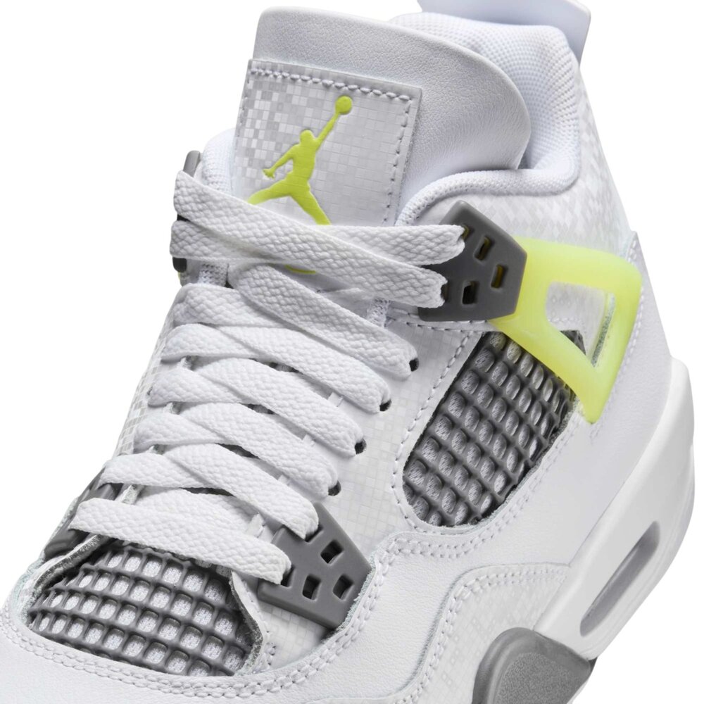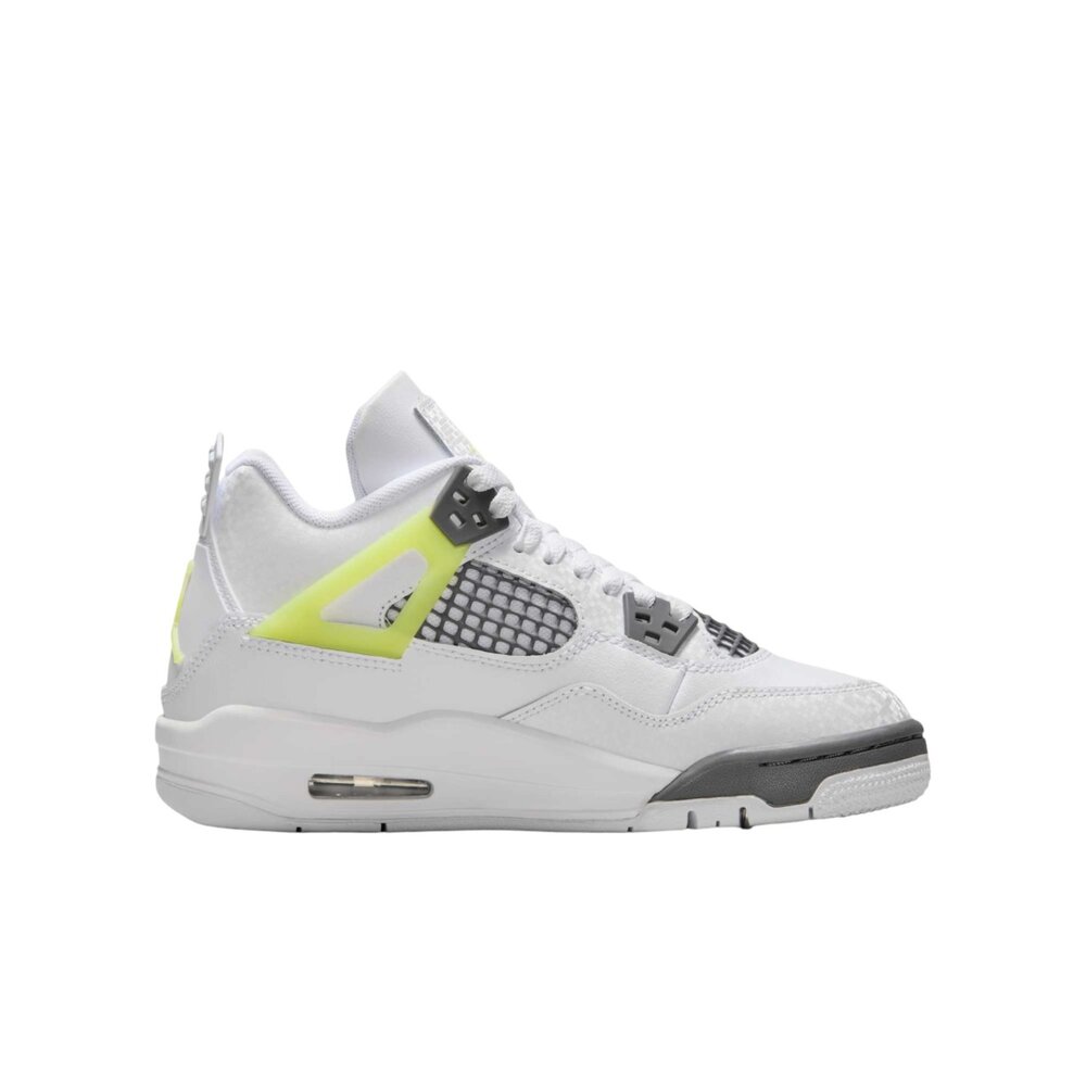 全新 Air Jordan 4 GS,白色和淺檸檬色。經典設計與鮮豔色彩結合,打造時尚舒適的運動鞋。非常適合兒童,具有氣墊和耐用的外底。對永恆標誌的俏皮演繹。