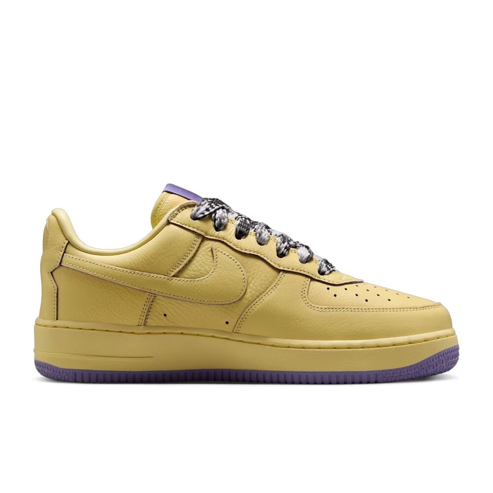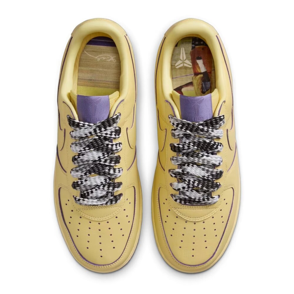 這款鞋的設計靈感源自鞋墊上那張經典照片:Kobe 穿著寬鬆的黃色練習球衣、搭配短褲和柔軟的法蘭絨睡衣,右手還打著石膏練習著。鞋身採用優質的柔和黃色皮革,點綴暗紫色細節,並搭配與他著名睡衣相符的針織鞋帶,完美體現了那一刻的精神。