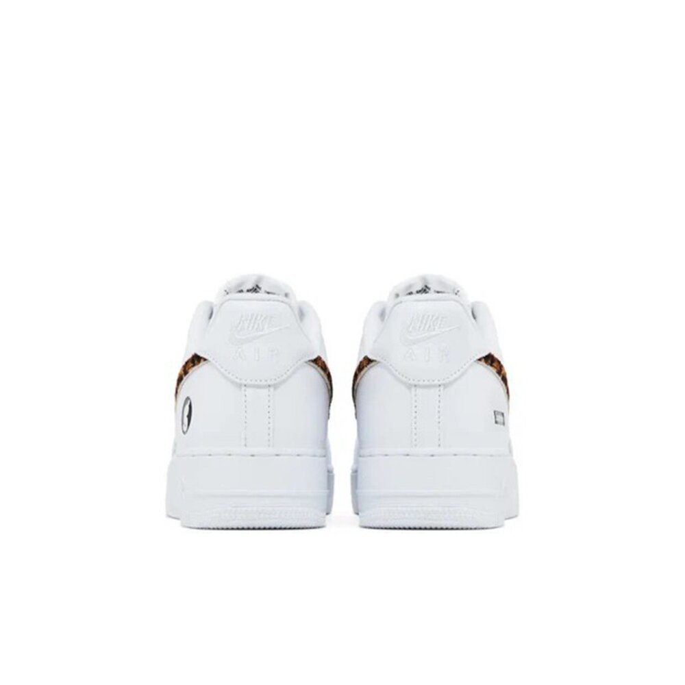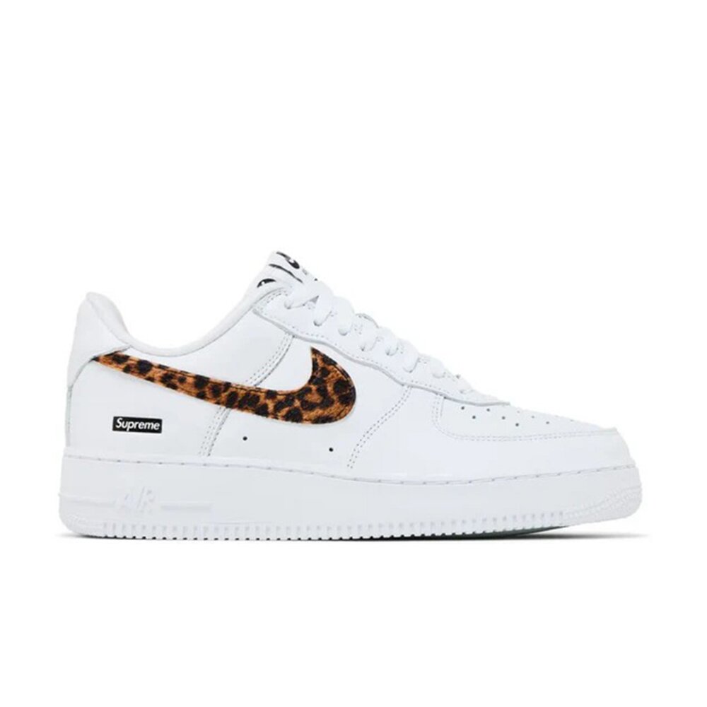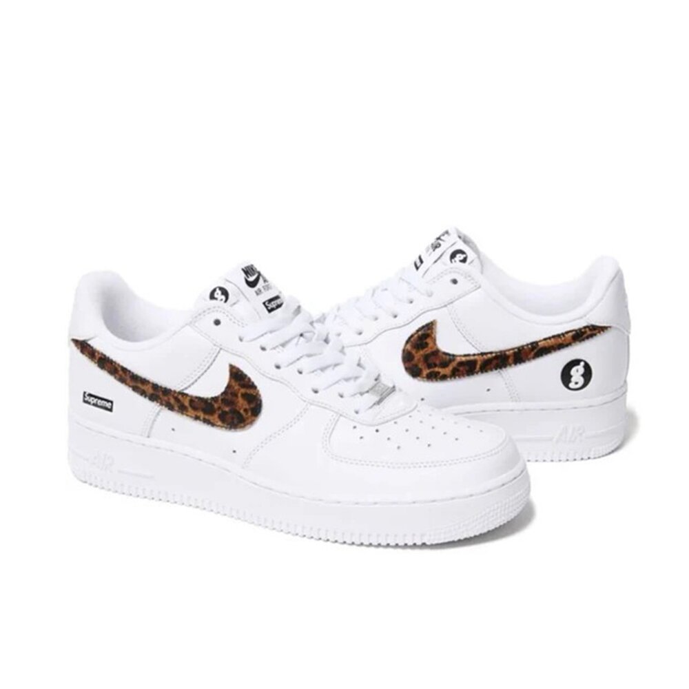 這次合作選用經典的 「Triple White」Air Force 1 為基底,側邊 Swoosh 換上搶眼的豹紋圖騰;Supreme 的標誌性紅框 logo 點綴右後跟,左後跟則是 Goodenough 的小寫 「g」 標誌。鞋舌與鞋墊上印有雙品牌字樣,而鞋底更設計巧思,半透明材質下方清晰可見拼字「SUPOODENOUGH」。