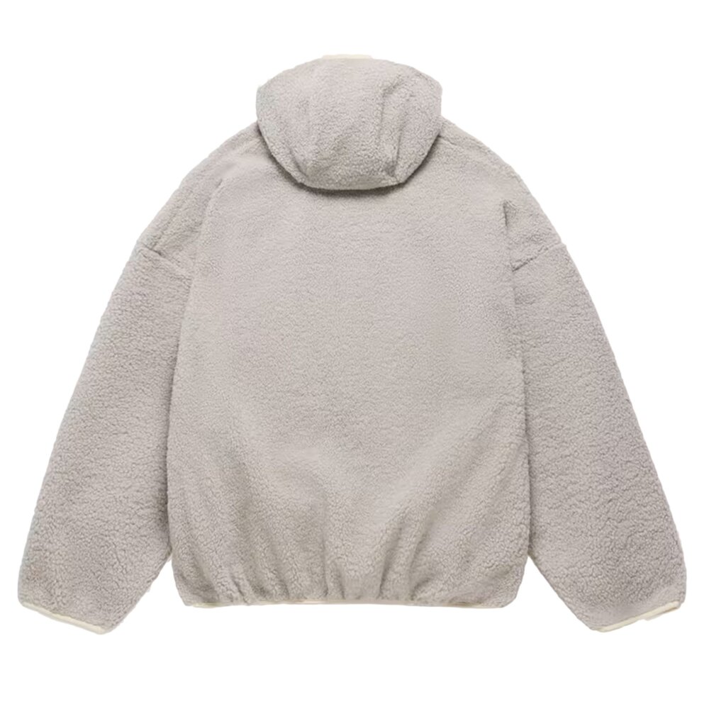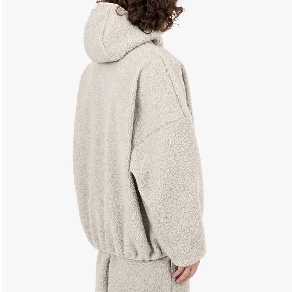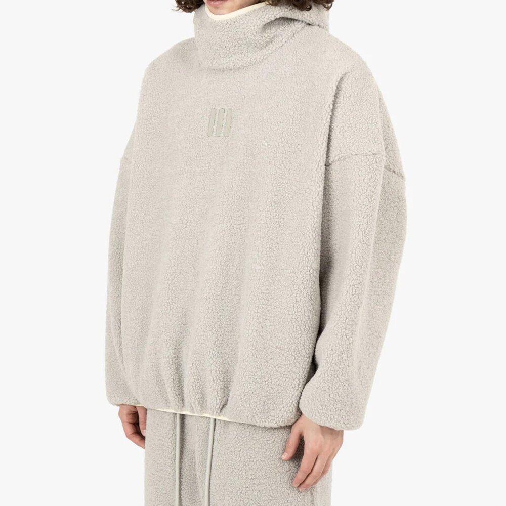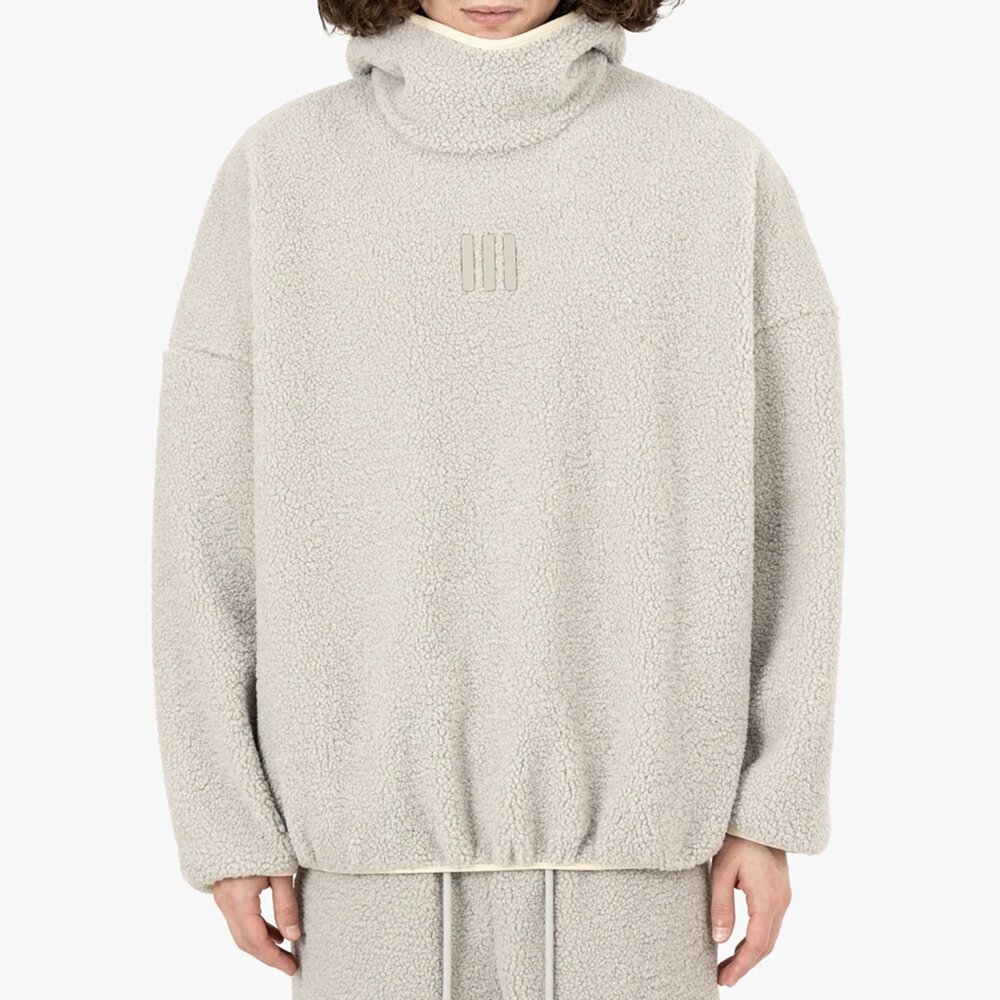Fear of God Athletics 出品的阿拉斯加連帽衫採用厚重搖粒絨製成,提供溫暖、舒適和結構。標誌性的 Fear of God 剪裁在衣身和袖子上寬鬆,提高了活動自由度。功能細節包括側縫口袋以及高領兜帽、袖子和腰部下擺的鬆緊帶。正面中央的金屬三柱標誌象徵極簡主義品牌。