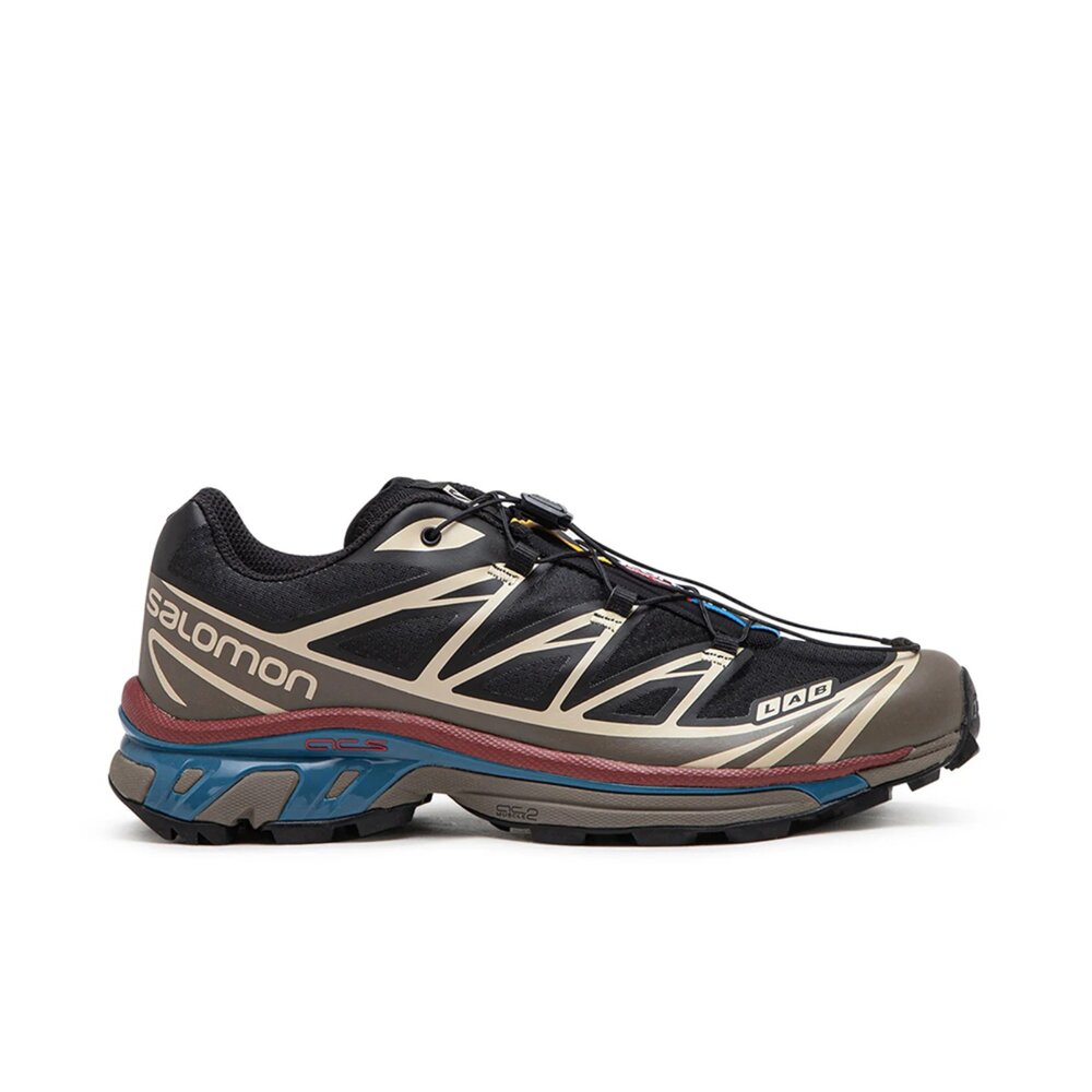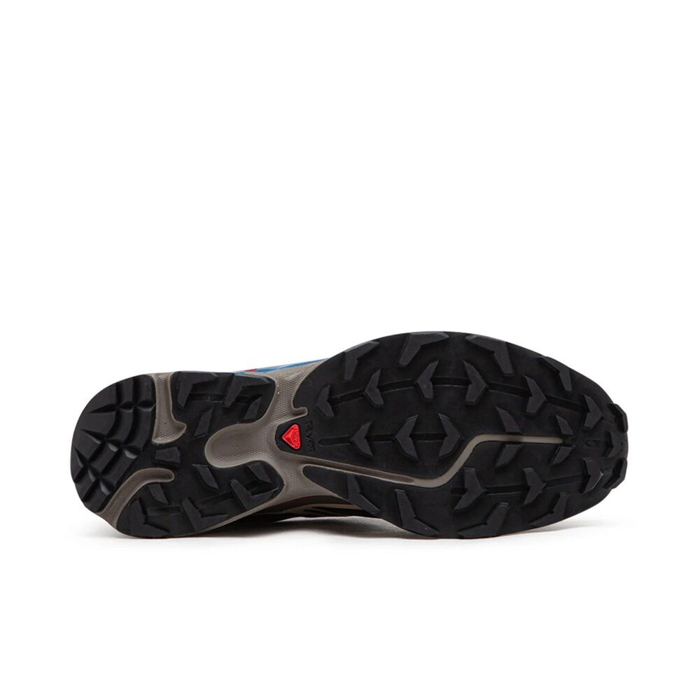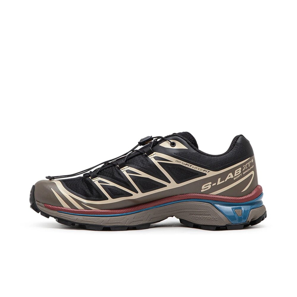 Salomon 的經典 XT-6 今秋以繽紛色彩閃耀。鞋面採用堅固耐用的棕黑色 TPU 材質。淺棕色鞋底點綴著銹紅色和藍色。