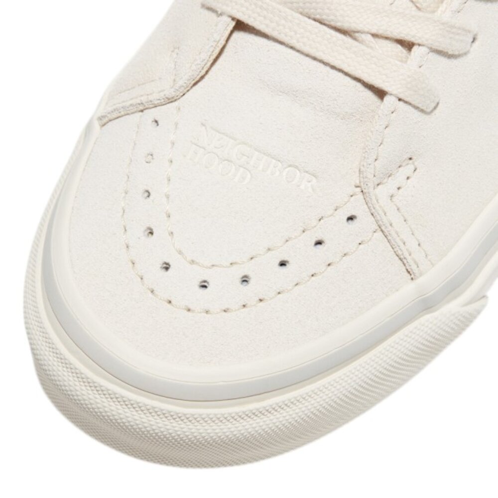 本次聯名推出兩雙Sk8-Mid 83 DX鞋款,分別搭配黑色和樺樹白兩種極簡風格配色展現其質感。兩雙鞋款鞋身全身被短絨麂皮材質覆蓋,側邊條紋、鞋舌都是同色系的麂皮。僅有包邊水線選用了低飽和的灰色進行色彩層次的點綴。細節方面,NBHD 在鞋頭後跟兩處將品牌Logo 以壓紋的方式呈現出來,鞋舌的織嘜標也有NBHD 的Logo 字樣,大底包邊上NBHD 刻上代表性的標語""CRAFT WITH PRIDE TOKYO EST. 1994"" 彰顯聯名獨特的屬性。